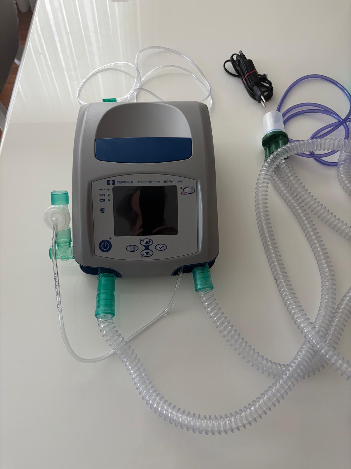 The examined COVIDIEN Puritan Bennett 560 ventilator is a physically undamaged, cosmetically very clean set presented with all its essential components (bag, power cable). The presence of an unopened spare respiratory circuit, in particular, is an important detail that enhances the product’s value. According to visual evidence, the device is in a physical condition ready for use or installation.