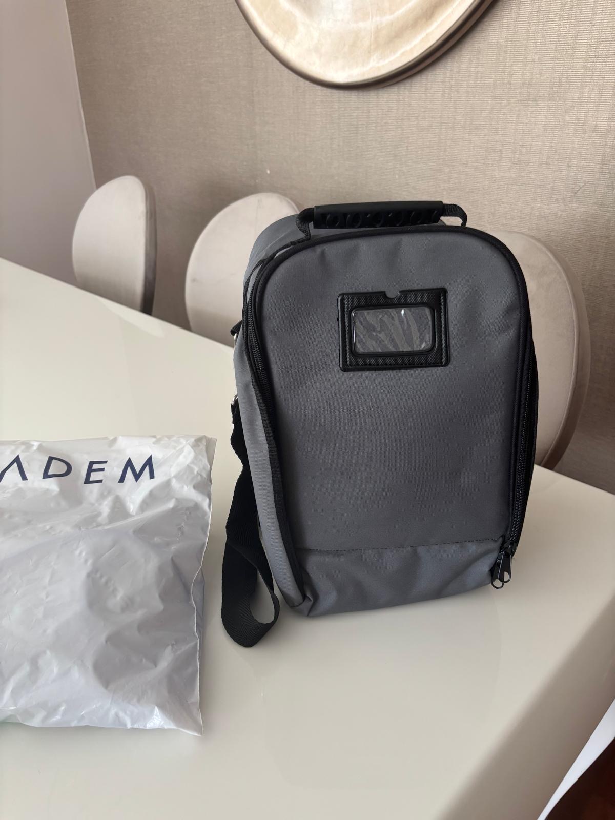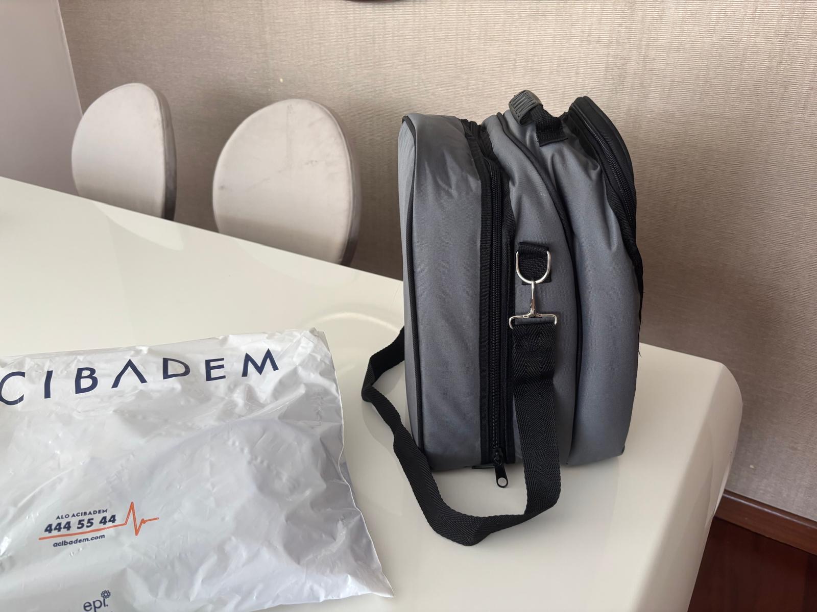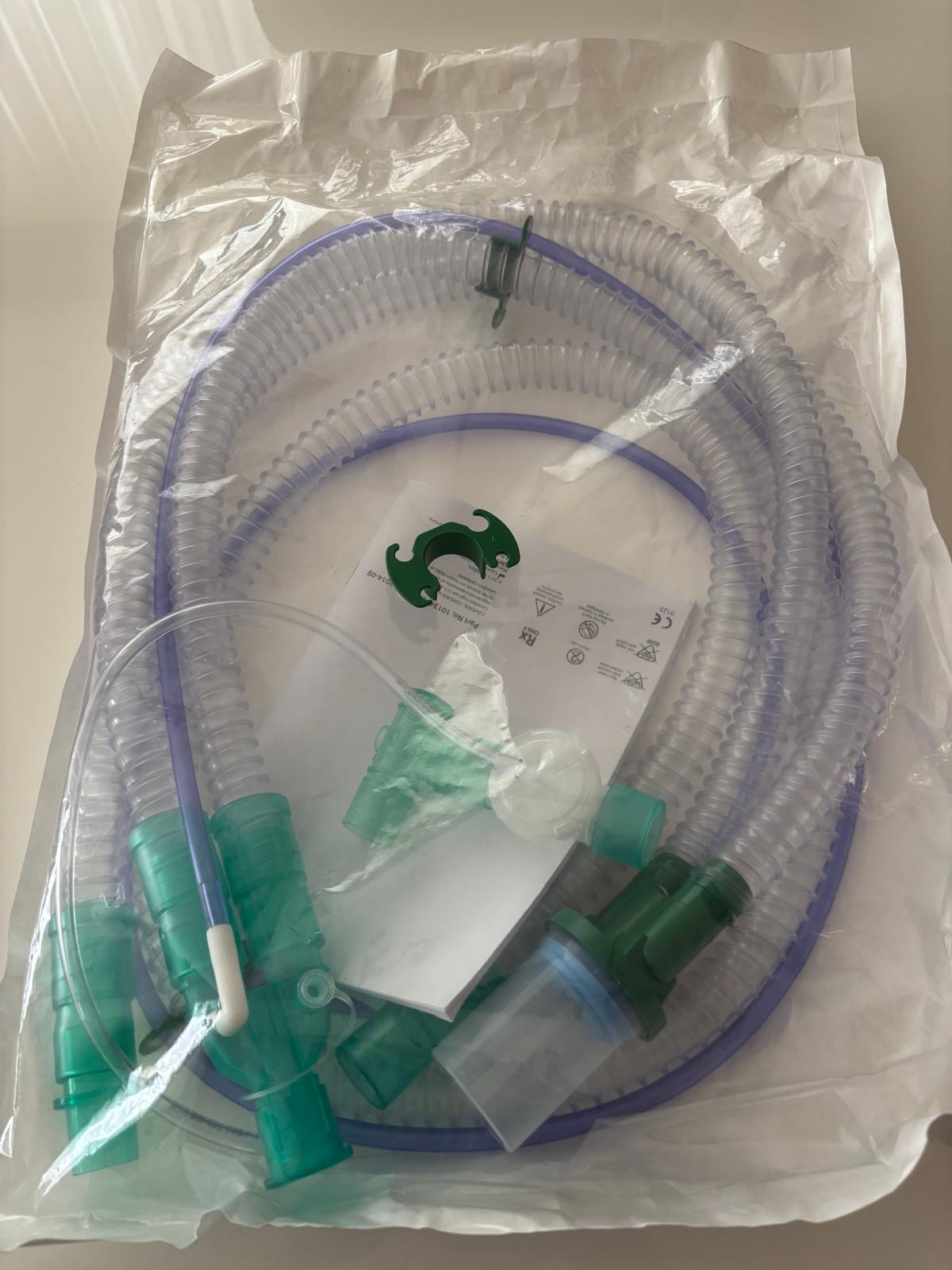 The main product examined in the visuals is a portable mechanical ventilator device used for medical purposes. The device is designed to assist patients experiencing respiratory distress with breathing or to fully take over the respiratory function. Alongside the device, there is a specially designed bag for carrying it, a power cable, and breathing circuits (hoses) that provide air delivery to the patient.