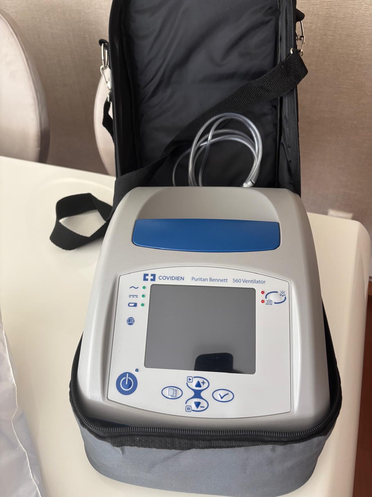 The logos and texts on the product’s front panel have been clearly analyzed. The device’s brand is identified as COVIDIEN, and the model as Puritan Bennett 560 (PB560). The model name is clearly written on the front face of the device, just above the screen, as “Puritan Bennett 560 Ventilator”. No assumptions have been made; the text in the visual has been reported with 100% certainty.