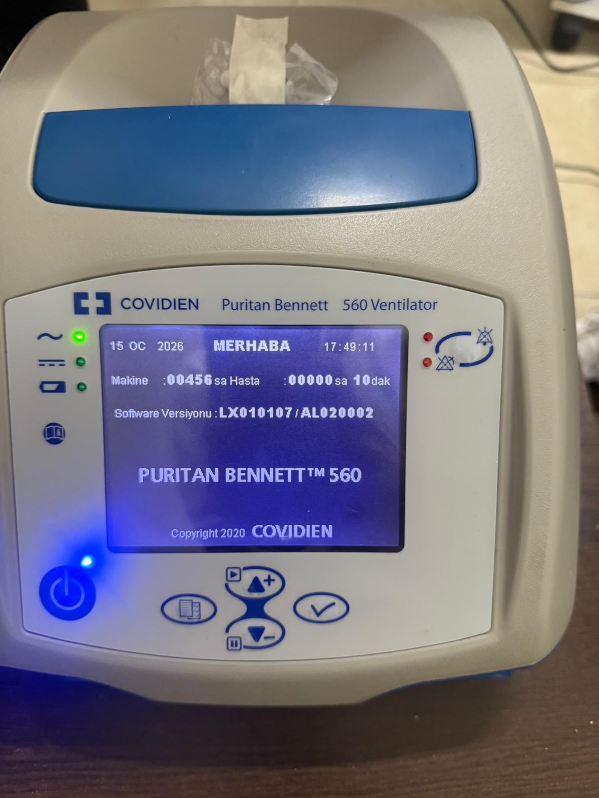 Upon detailed examination of the images, brand and model information is clearly legible on the device’s front panel and screen. The device’s brand has been identified as COVIDIEN, and its model as Puritan Bennett 560 Ventilator. The phrase “PURITAN BENNETT™ 560” is also clearly visible on the device’s startup screen.