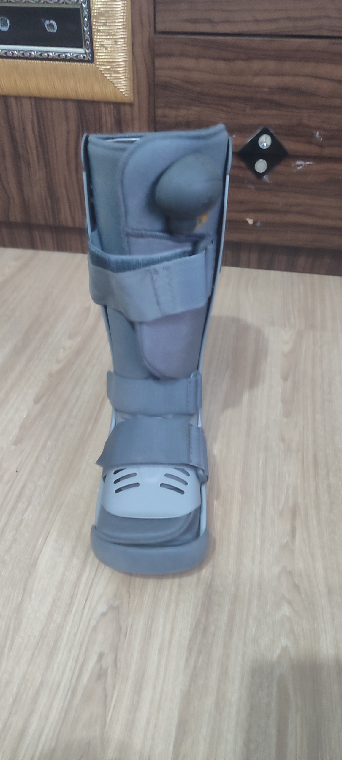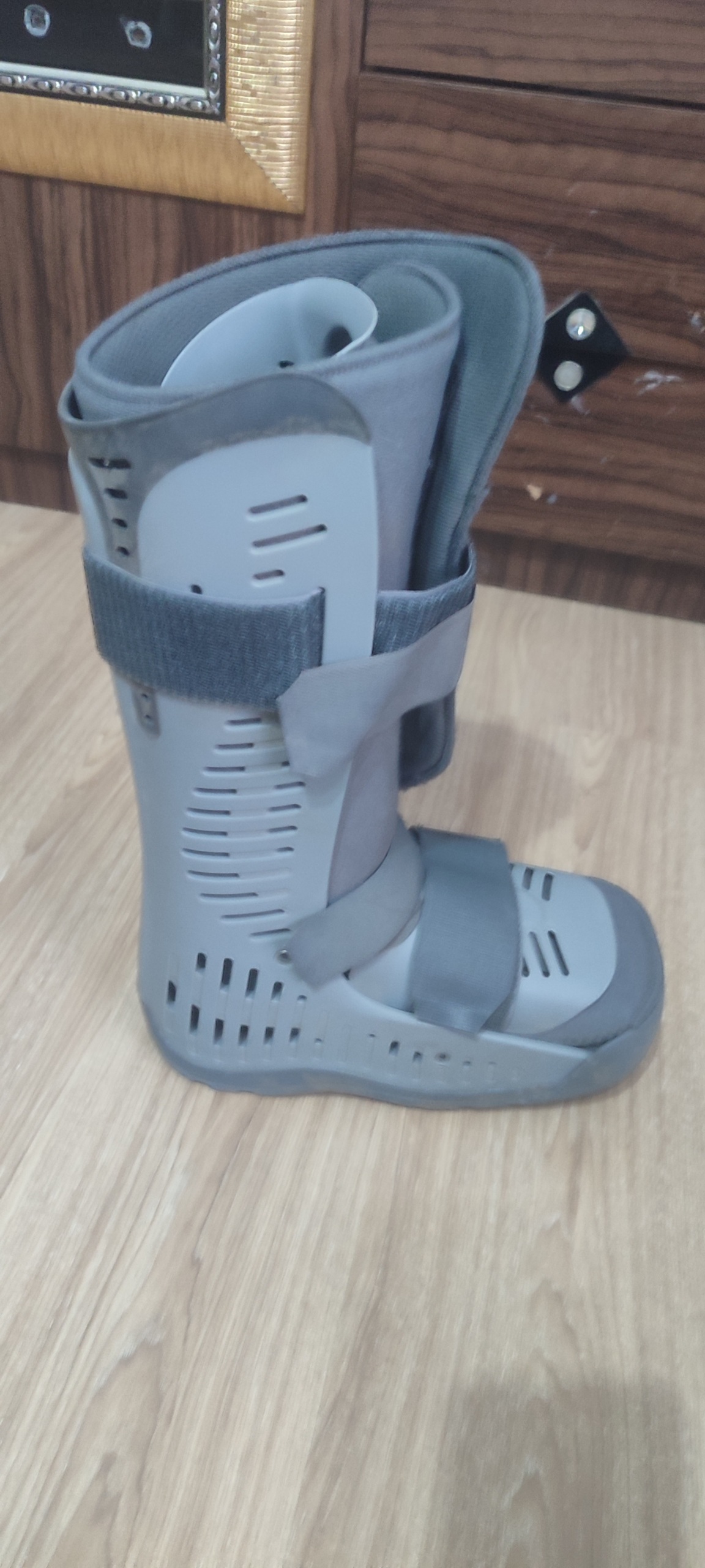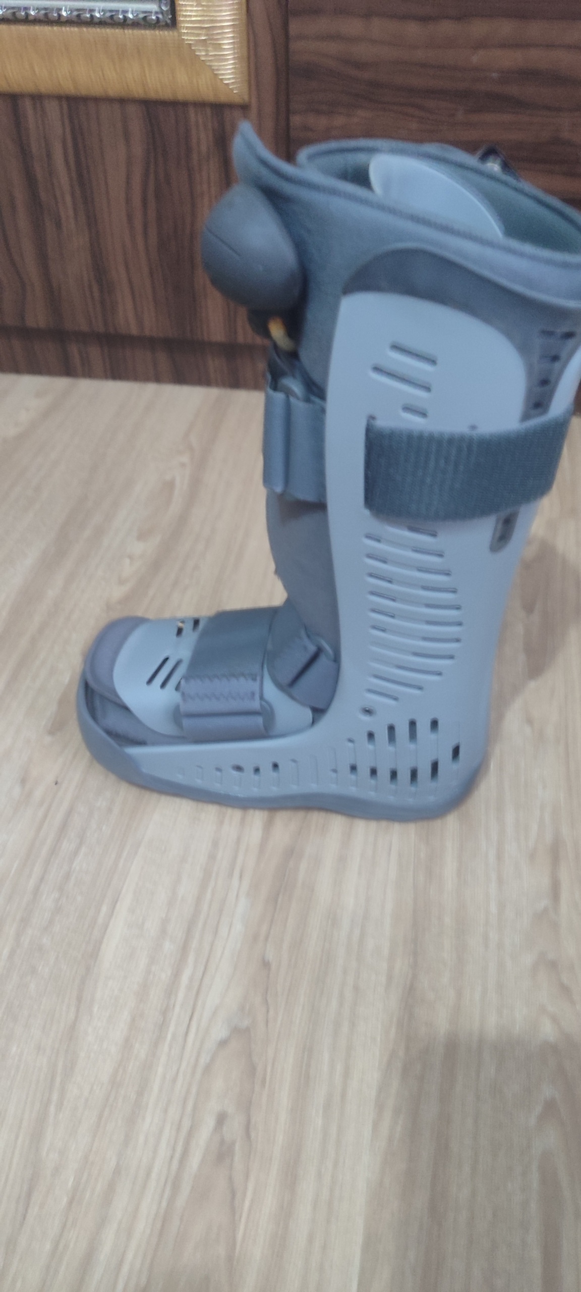 The examined visuals belong to a medical product designed for foot and ankle immobilization. This product is an orthopedic device known in medical literature as an “Air Walker” or “Air-Cushioned Walking Boot”. The product features a rigid outer exoskeleton structure, containing a soft liner and an air cushion system.
