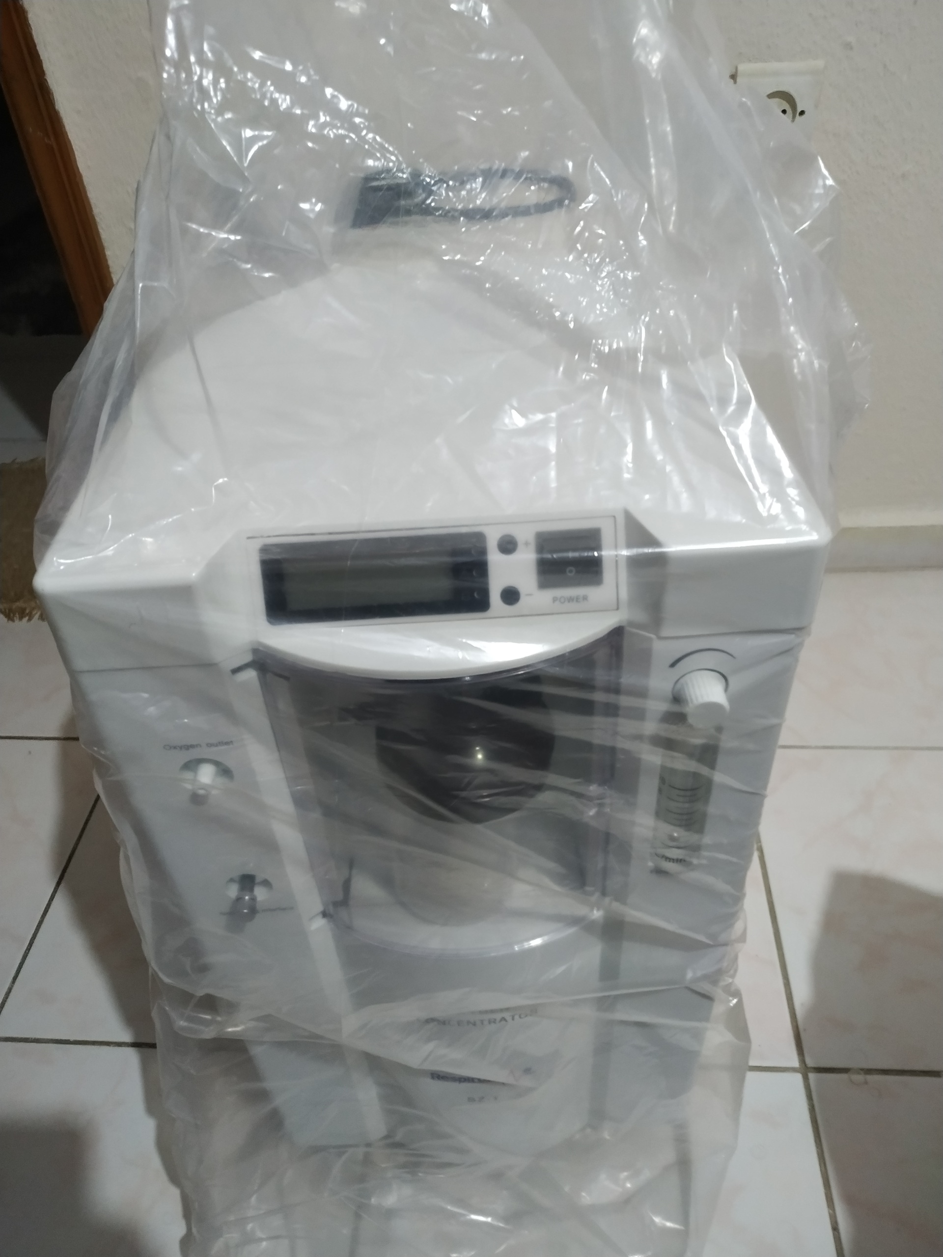 The visuals show an oxygen concentrator device packaged in its original cardboard box. The product is a device used to provide medical oxygen support. The visual set includes the device itself, its packaging, a power cable, and user documents. According to the information on the box and the device, the product separates oxygen from ambient air to produce concentrated oxygen.