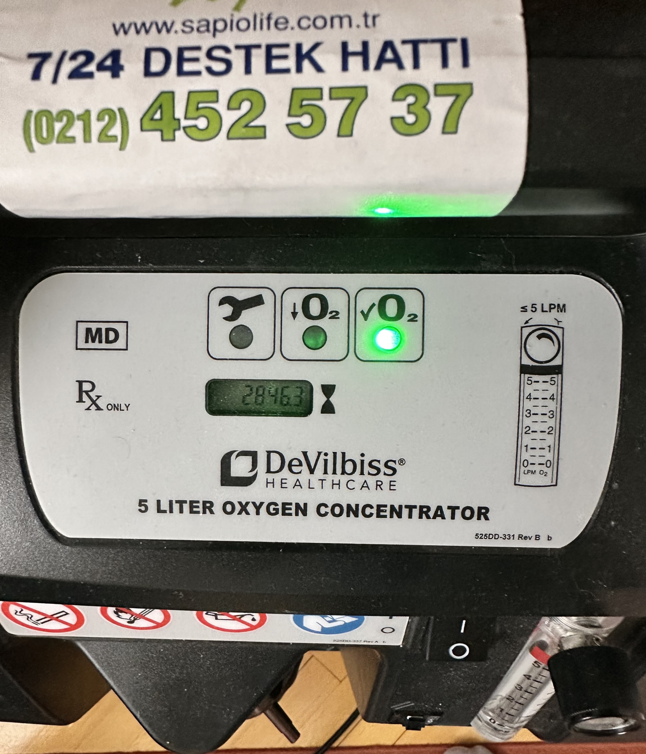 - Service Label: An additional communication label has been affixed to the top of the device, displaying www.sapiolife.com.tr, 7/24 SUPPORT LINE, and (0212) 452 57 37.