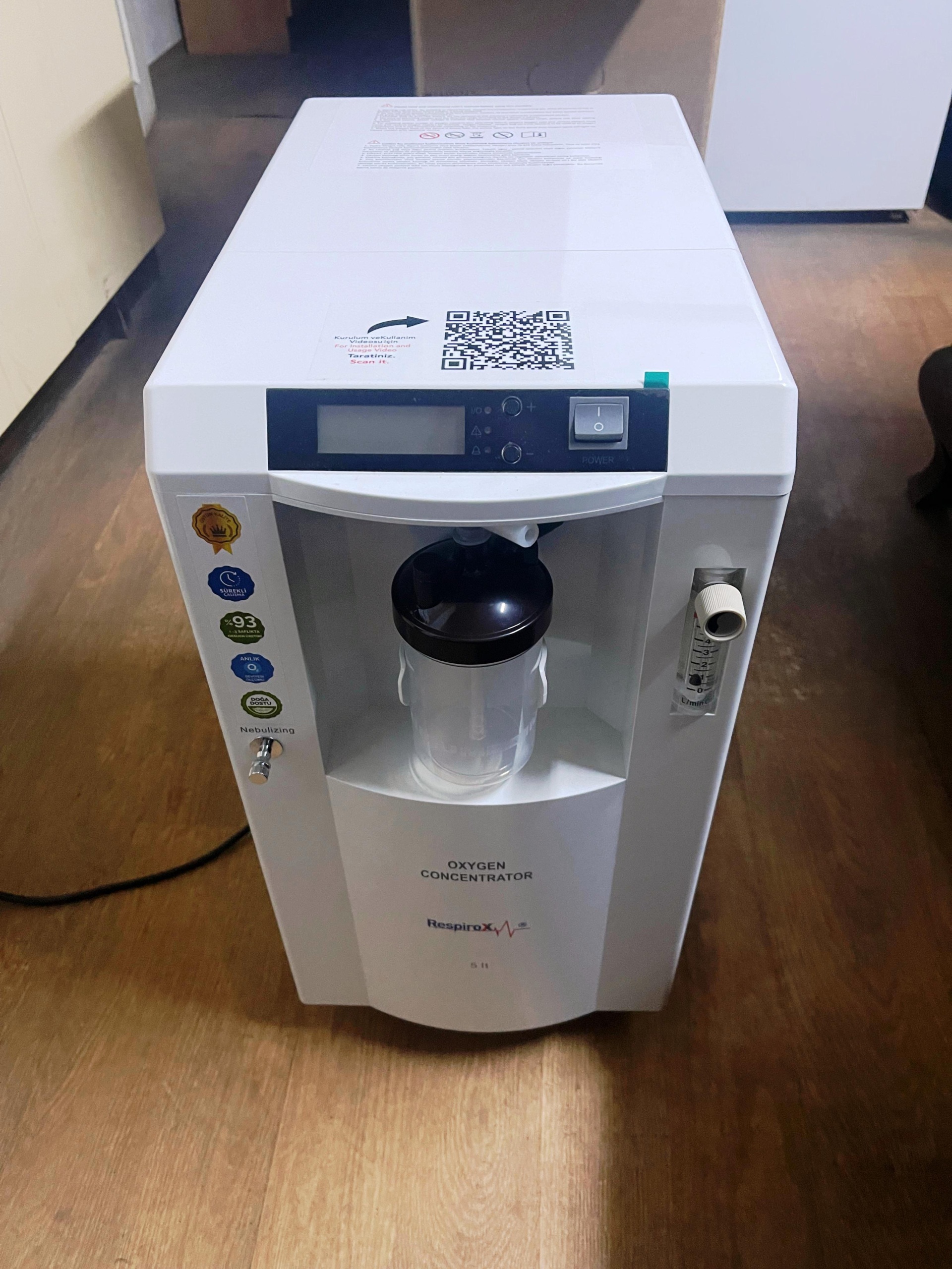 The product shown in the images is an electric oxygen concentrator used in respiratory treatments. Based on the prominent markings on the device’s front panel, its brand has been identified as RespiroX, and its model and capacity as 5 lt. The images show 1 main device and 1 humidifier bottle attached to the device.