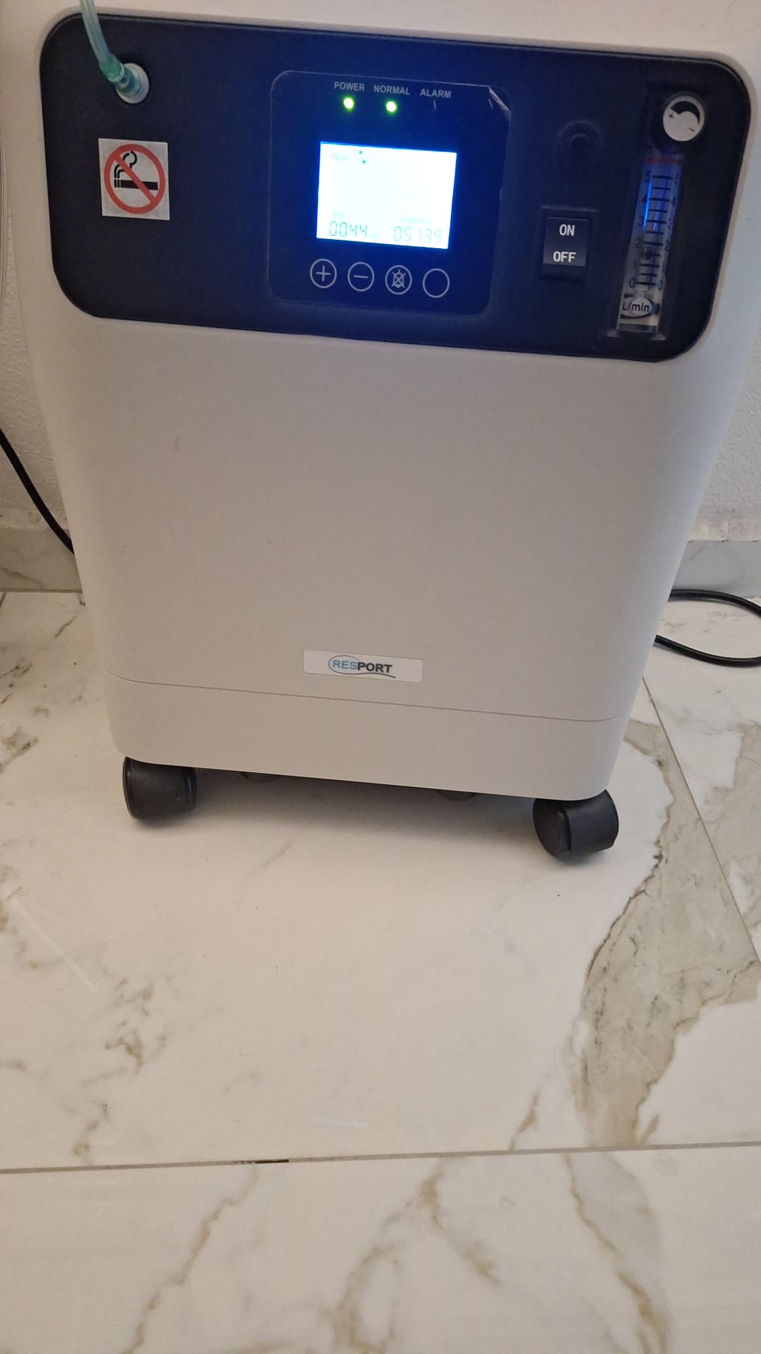 There are four wheels on the bottom of the device providing mobility, and no visible damage is present on the wheels. The flowmeter on the front panel is in good condition and appears to be capable of measuring up to 5 L/min. The buttons on the electronic control panel and the on/off switch appear physically sound. The device’s operation is indicated by the screen’s illumination and the lit green notification lights.