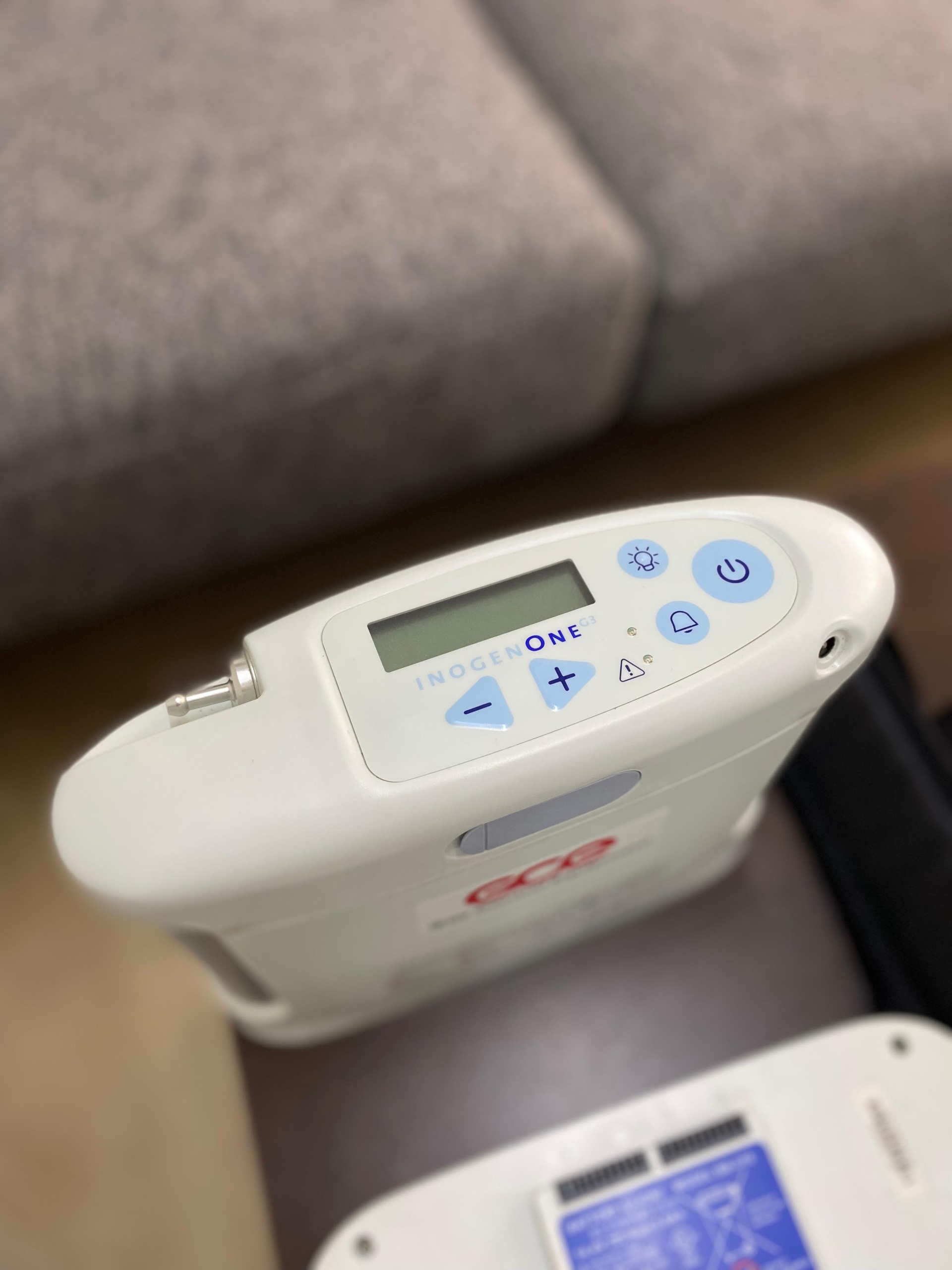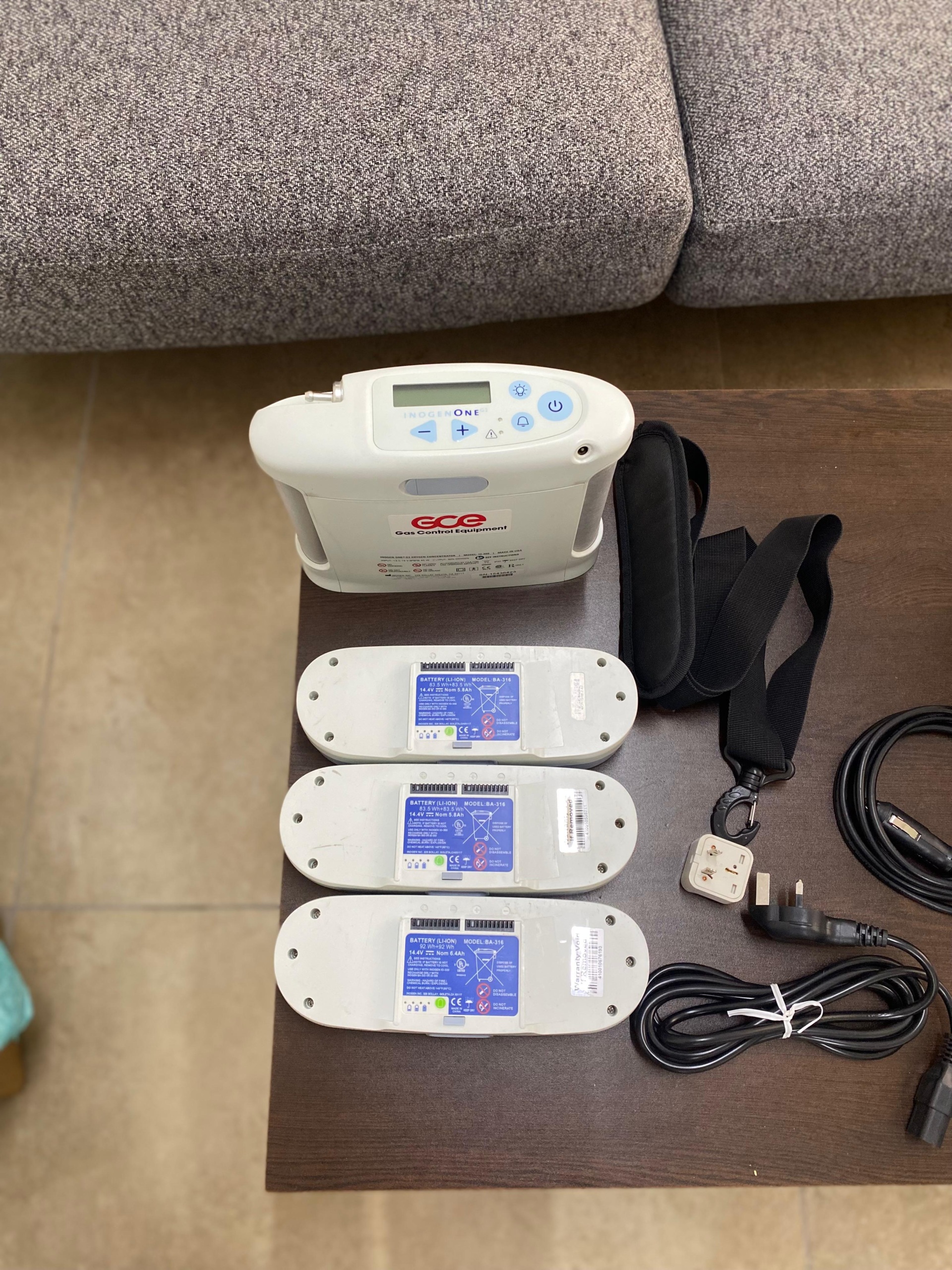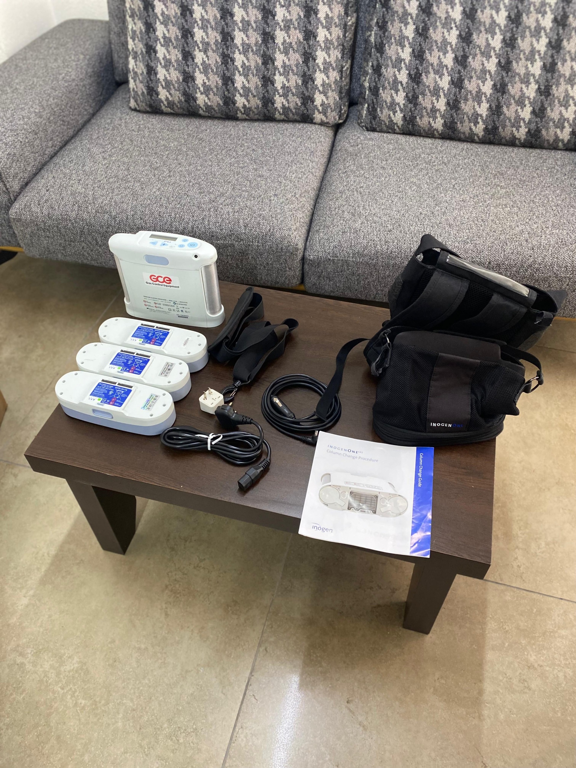Based on the markings on the device’s upper control panel, carrying bag, and user manual, the product’s brand and model have been identified as Inogen One G3. An adhesive label with the GCE Gas Control Equipment logo, which appears to have been affixed later, is present on the front body of the device.