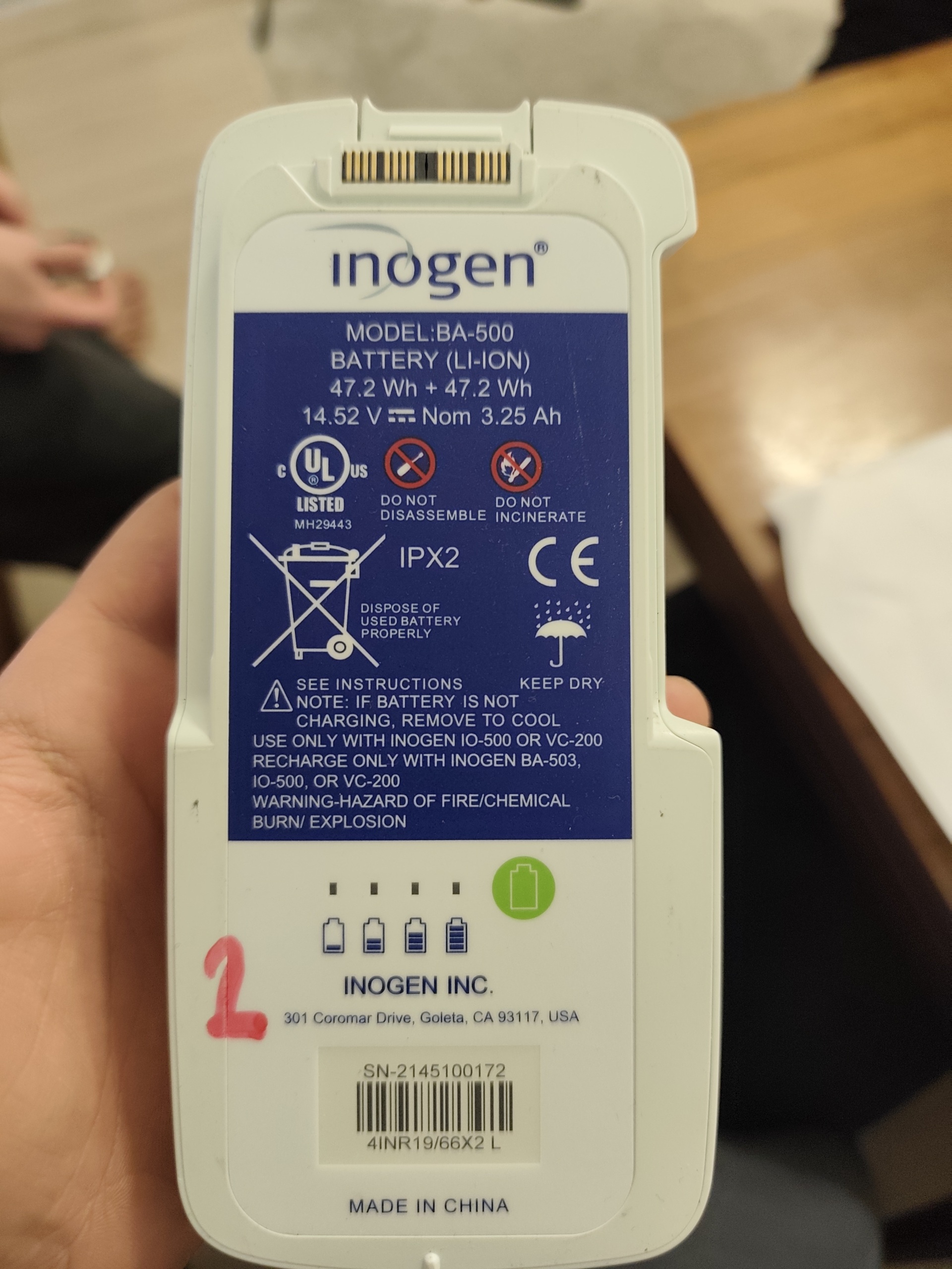The general condition of the device and battery appears used. Light dirt and dust accumulation is present around the device’s control panel and on the buttons. The white plastic surface of the battery casing shows minor scratches and scuff marks due to use. A red pen-written number “2” is present on the bottom left corner of the battery label. The device’s screen is off and shows no apparent damage. The oxygen outlet port appears to be intact.