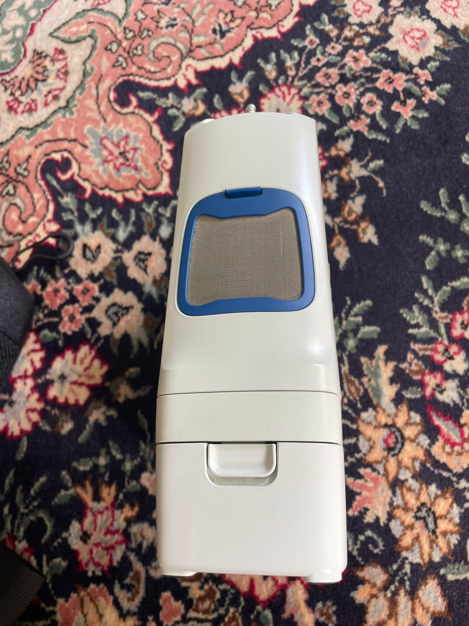 - Carrying case (The bag itself is not visible, the background is a home carpet).