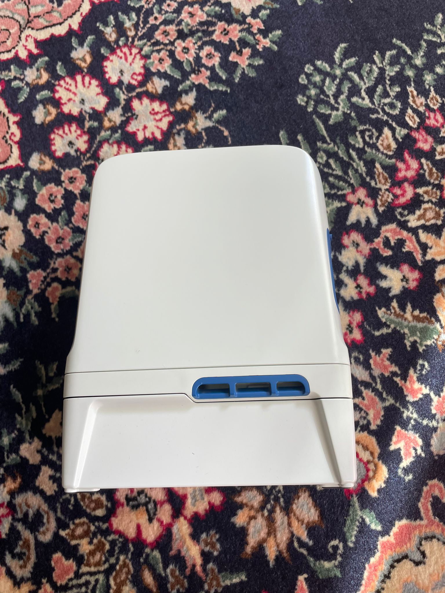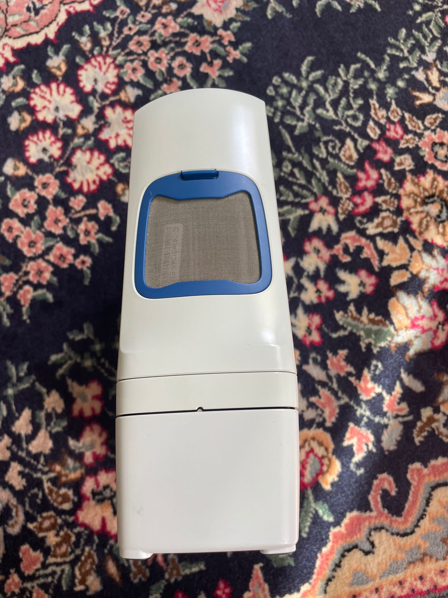 The device’s outer casing is made of white hard plastic. Its general condition is second-hand (used), yet it appears quite clean and well-preserved. No significant scratches, cracks, breaks, or color fading (yellowing) have been detected on the body. Deep impacts or abrasions are not visible in the impact protection areas at the corners. The blue air inlet filter covers and metal mesh filters are intact; no excessive dust accumulation has been observed in the filter pores, suggesting the device has been used in clean environments.