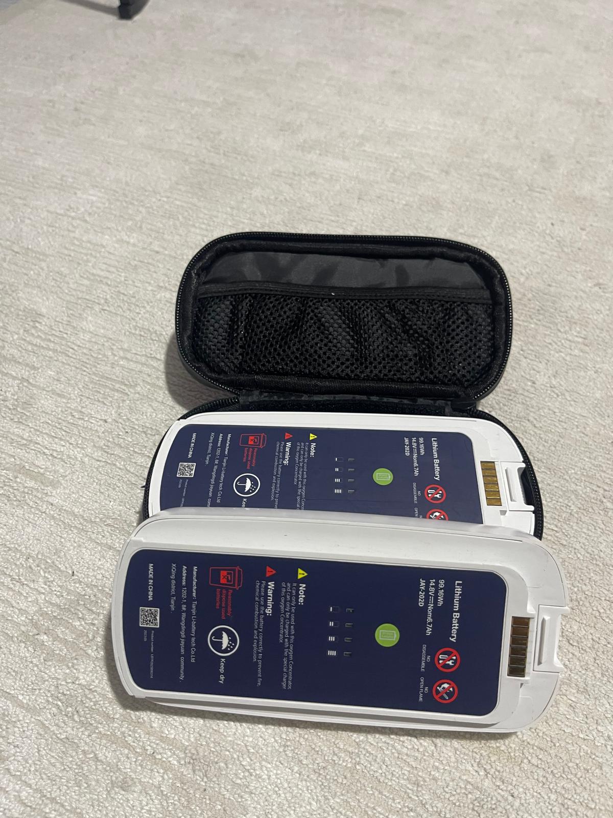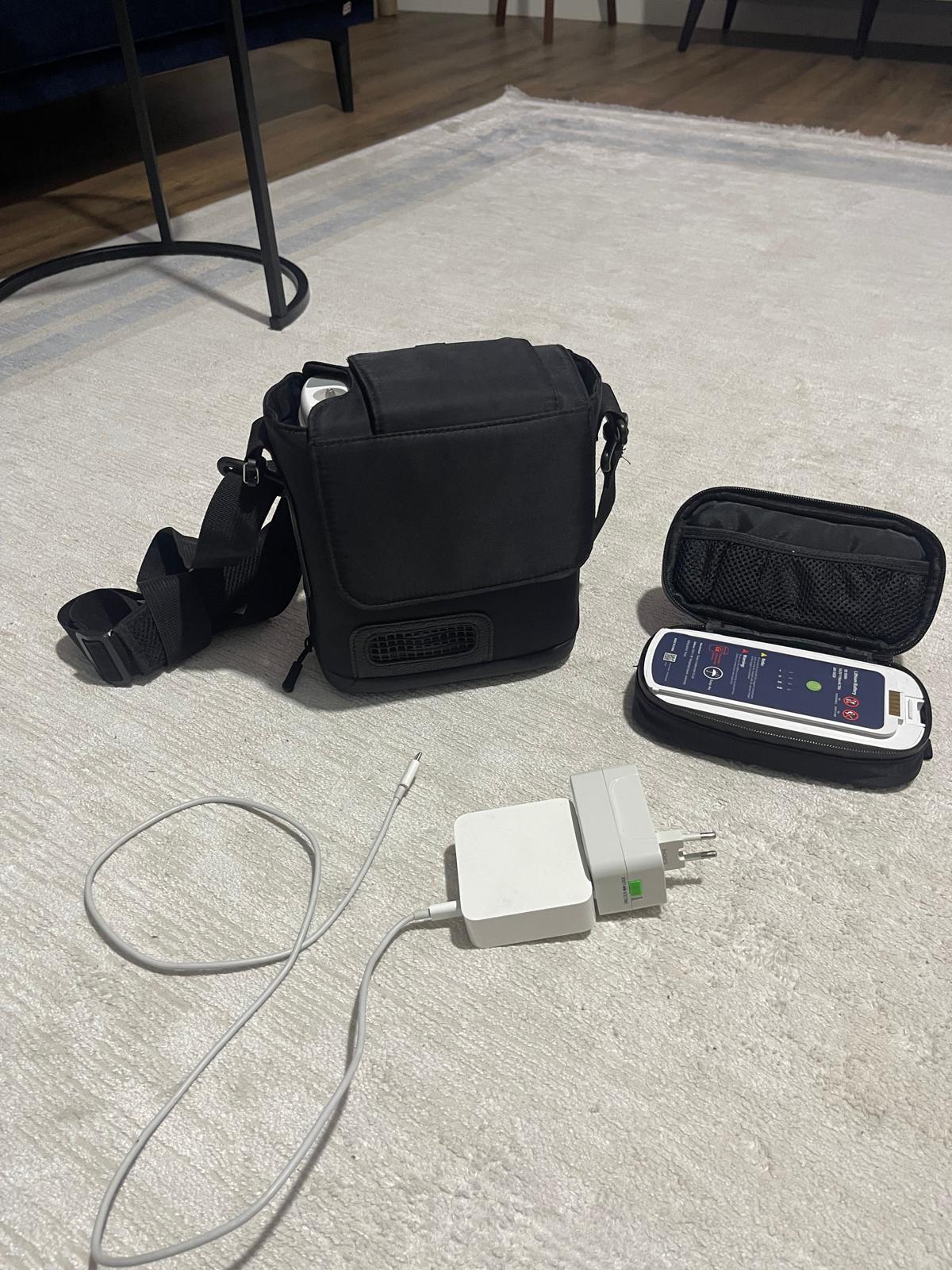The examined images belong to a portable oxygen concentrator, which is a medical device used for respiratory support. The device is designed to meet the mobility needs of patients thanks to its portable structure and battery support. In addition to the main unit, the images show a carrying bag, power adapter, and external battery modules.