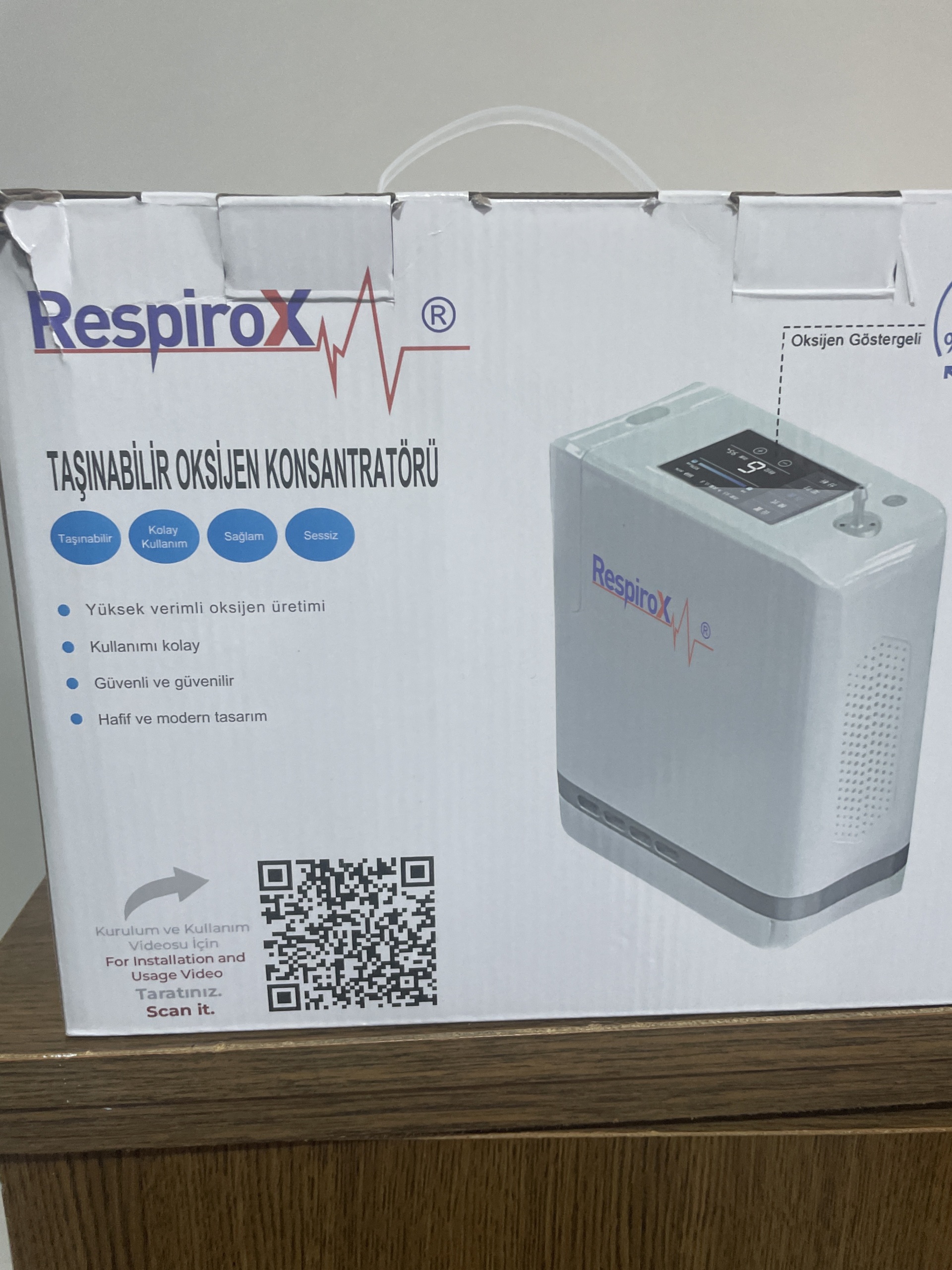 In the visual, a medical device is seen within its original packaging. Upon examination of the clear text and logos on the packaging, the brand of the device has been definitively identified as Respirox. The product is described on the packaging in Turkish as Taşınabilir Oksijen Konsantratörü (Portable Oxygen Concentrator). The front of the packaging features an image of the device, the brand’s logo, and the product’s basic features. A specific model number for the device cannot be read from this surface of the packaging.
