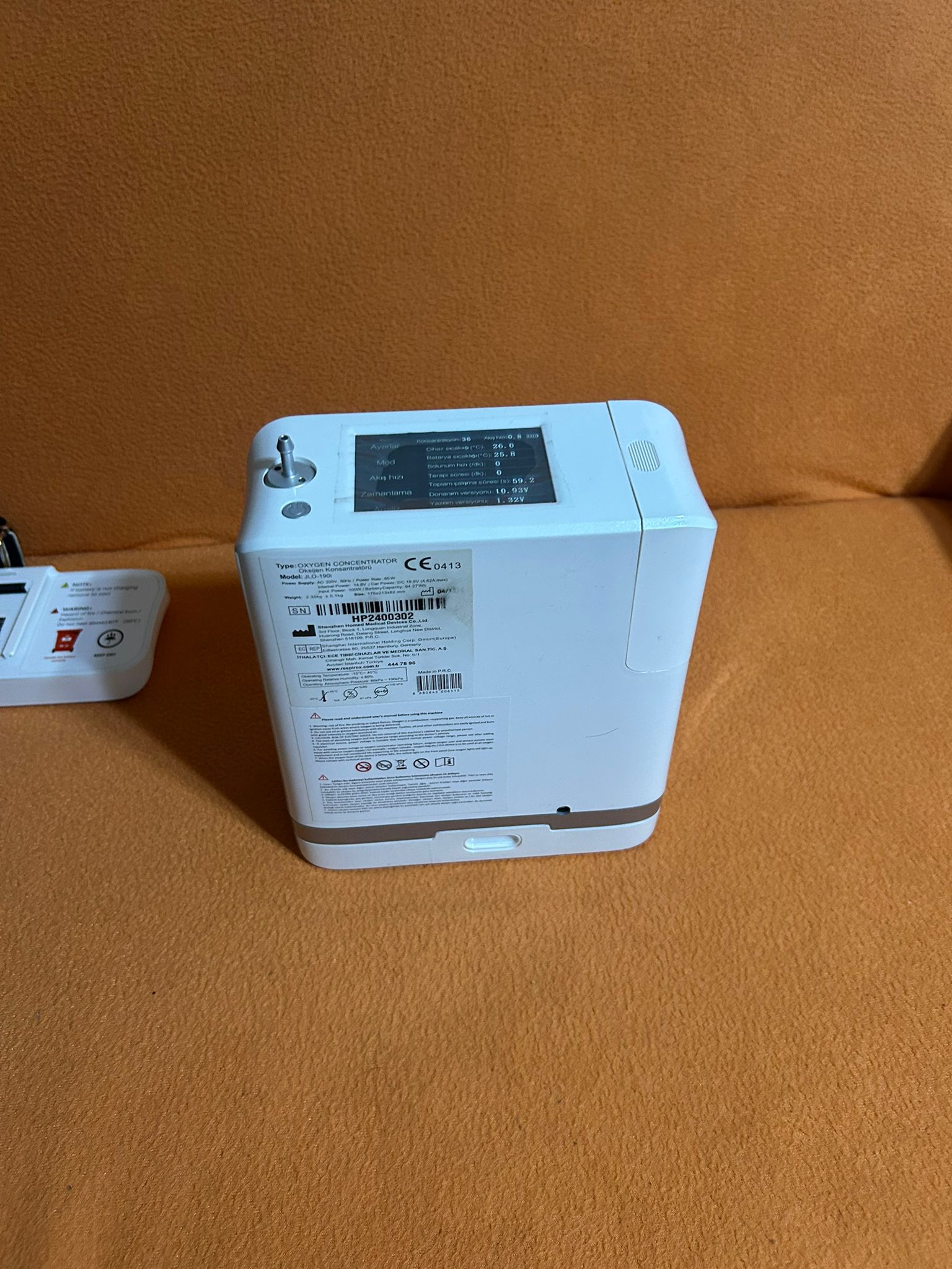 Based on visual evidence, it is concluded that this Respirox JLO-190I portable oxygen concentrator is an almost unused, nearly new product. The total operating time of 59.2 seconds displayed on the screen is the strongest evidence for this assessment. The device itself and its accessories are in physically flawless condition. No signs of any existing malfunctions were found in the visuals. Considering the product’s overall condition, no potential risk of malfunction is observed, and the device is deemed ready for use without issues.