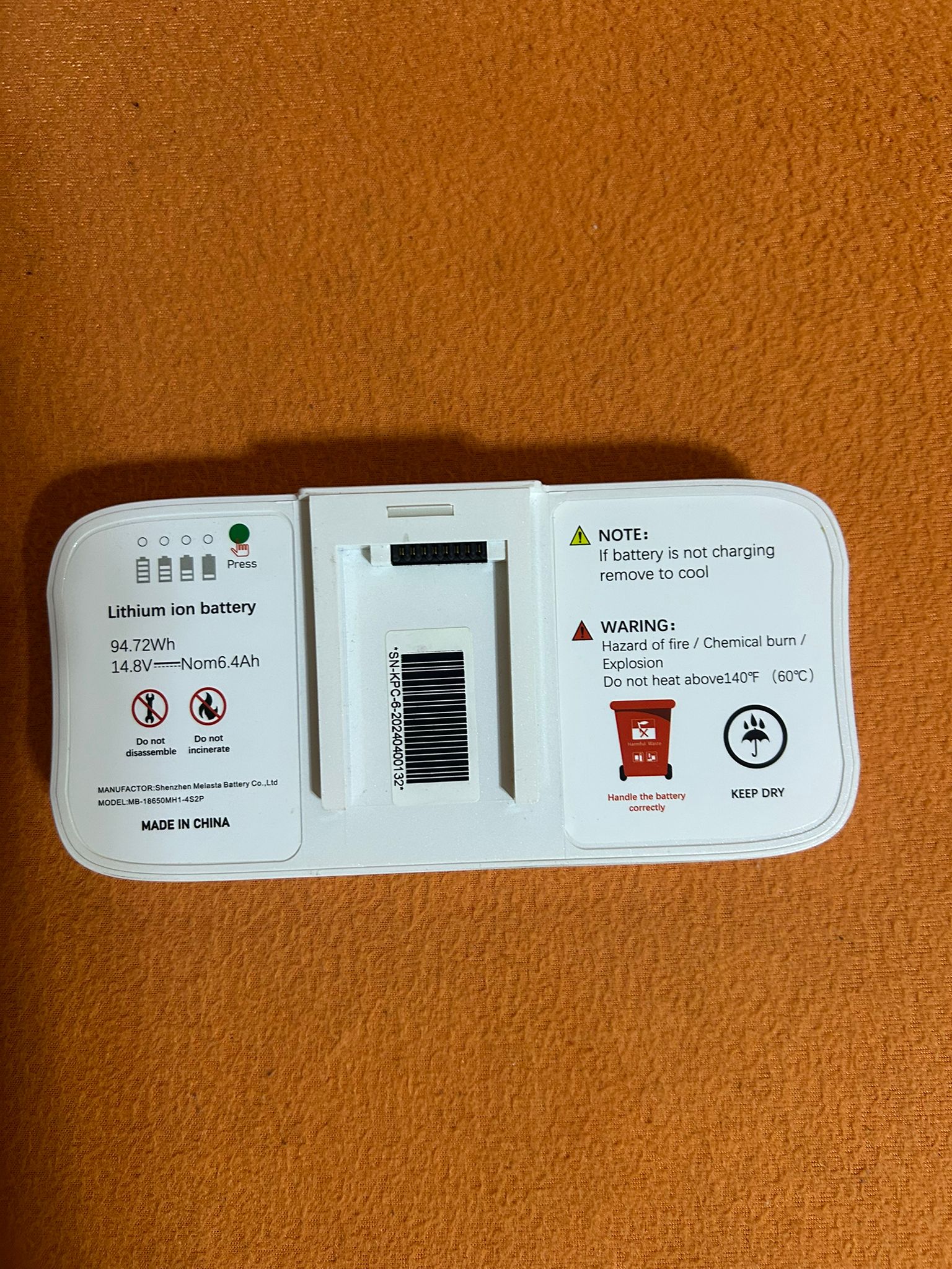 - Capacity: 94.72Wh / 14.8V / 6.4Ah