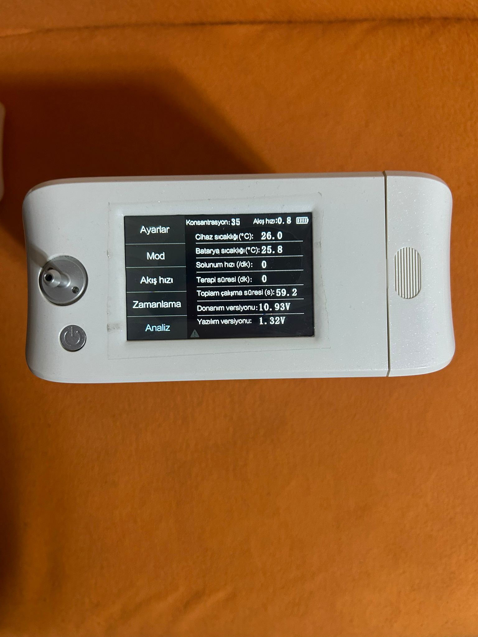 The device’s screen is observed to be functional and displaying data clearly. The information in the analysis menu on the screen provides important details about the device’s technical status and usage history. The most notable data is that the device has been used for an extremely short period of total 59.2 seconds. This indicates that the product has been used almost never. Other technical data displayed on the screen are as follows: