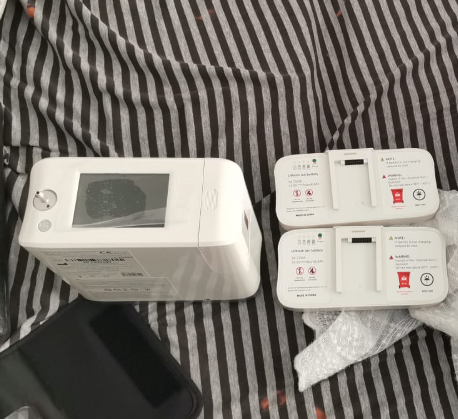 Detailed examination of the visuals revealed no cracks, breaks, yellowing, or deep scratches on the device’s white plastic casing. No detachment or wear is observed on the black carrying case. The product physically appears to be “in brand new condition”.