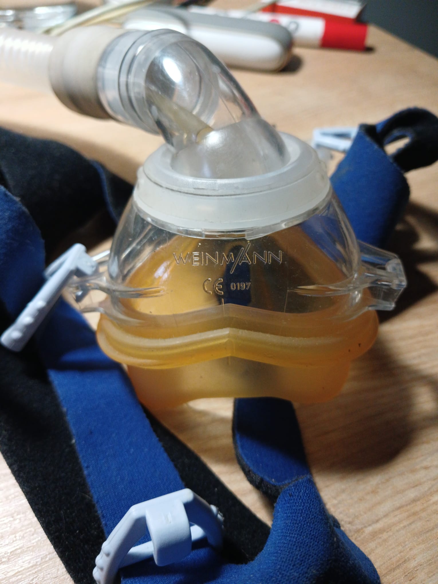 No cracks, breaks, or dents have been detected on the main device’s casing. However, there are slight friction marks and dust on the plastic surfaces. The most prominent physical deformation is observed in the silicone part of the mask. The mask silicone, which should be transparent, has noticeably yellowed and darkened in color. This indicates that the silicone material has reached the end of its service life, has been exposed to UV light or moisture, and has lost its hygienic properties.