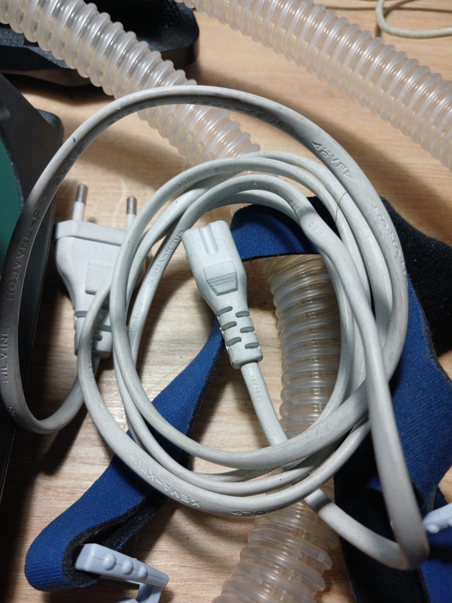 The power cable in the visuals is a standard “KEMA-KEUR” certified cable; no peeling or breakage is observed in its insulation, but its surface is dirty. The headgear is fabric-structured and may show signs of pilling and stretching; it is evident from the visuals that the fabric has been used. The device usually operates with mains electricity; no external battery pack or battery compartment is visible in the visuals, therefore, whether it has an internal battery cannot be confirmed from the visual.