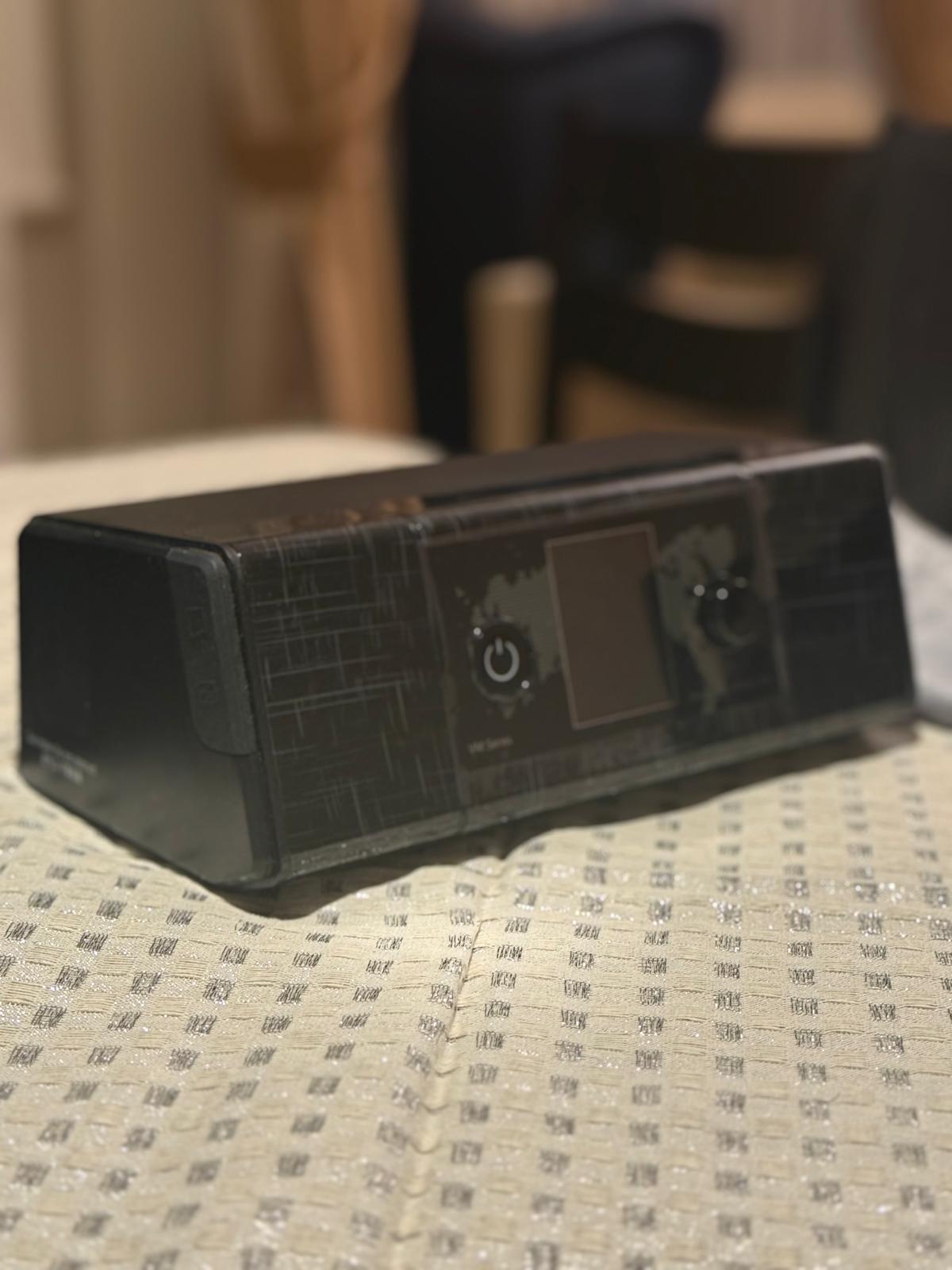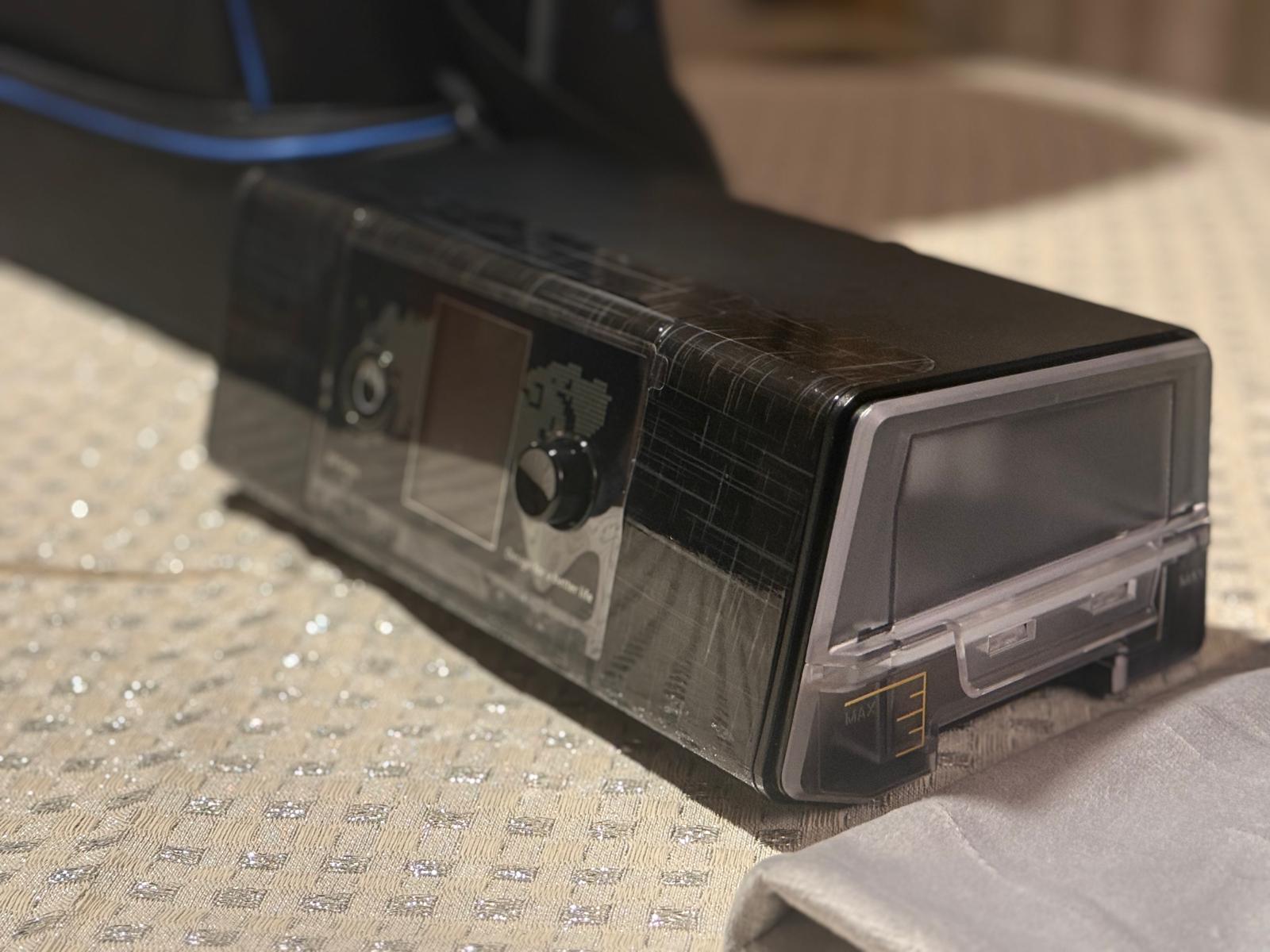 The general condition of the device is assessed as used. Numerous scratches and peeling are present on the protective film covering the top surface of the main unit. This deformation belongs to the protective film and does not provide clear information about the condition of the device’s casing itself. No visible cracks, fractures, or dents are found on the device’s casing. The carrying bag and other accessories are generally clean and in good condition. The breathing tube and mask, although not in their original packaging, appear visually clean.