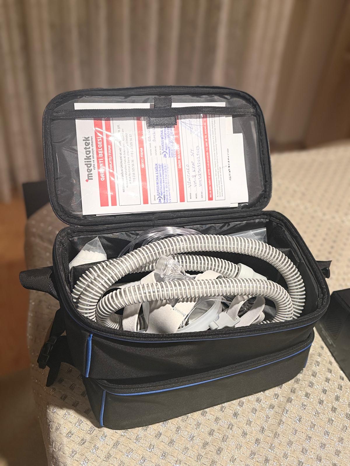Following the examination of the documents found inside the carrying bag, the product’s brand and model information has been clearly identified. The warranty certificate and the related form clearly state that the device’s brand is Ventmed, and its model is DS8 Auto CPAP Set.