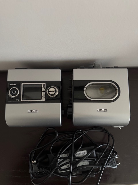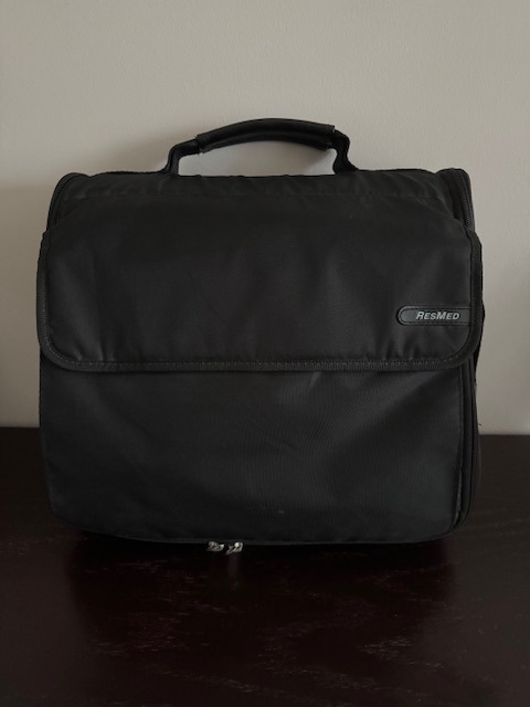 - Original Carrying Case: A black, compartmentalized, and protective original case with a metal “ResMed” logo plate on the front is present. Zippers appear intact.