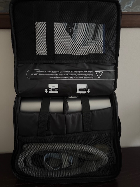 - Breathing Tube: A grey, spiral-structured breathing tube is located in the mesh bottom compartment of the bag.