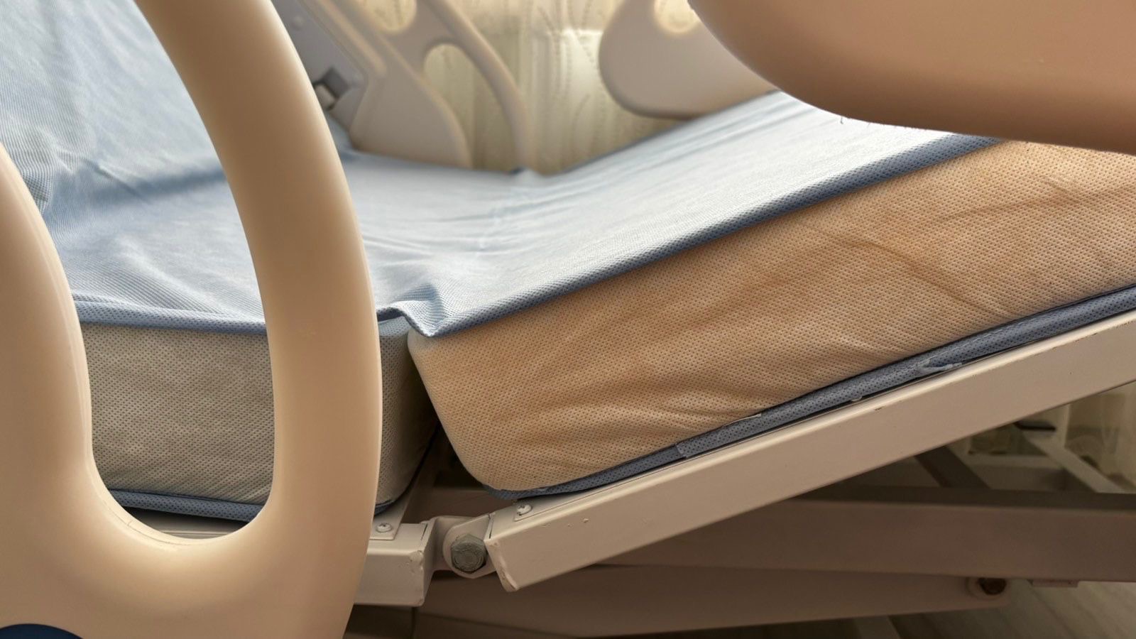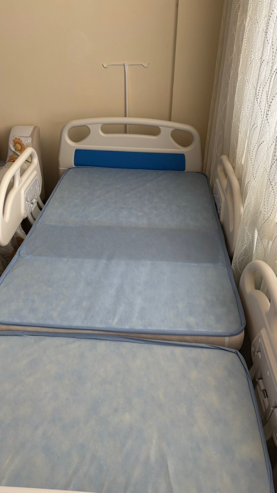 During a detailed examination of the images, a circular blue logo graphic was detected on the product’s plastic components; however, due to the resolution of the photograph and the shooting angle, the texts within the logo could not be read. Therefore, to avoid incorrect guidance, and in accordance with the principle of 100% certainty, brand and model information cannot be specified. Visually, the product falls into the category of a standard medical ABS-coated 3 or 4 motor hospital bed.