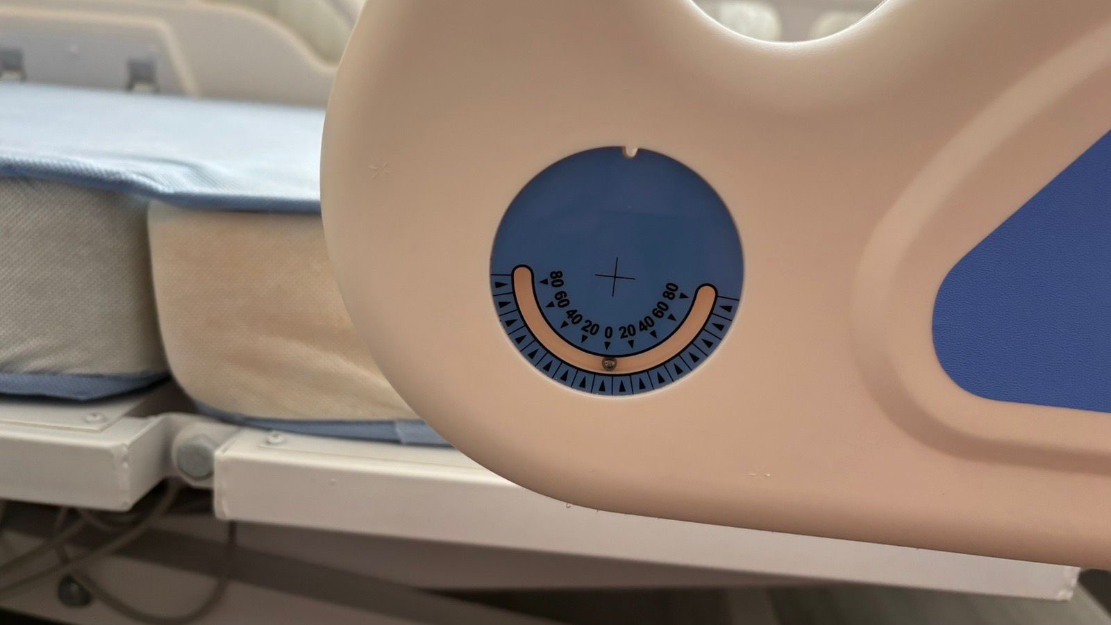 - Angle Indicator: An analog angle indicator is present on the side rail. The indicator dial bears the marks 0, 20, 40, 60, 80 degrees, and its needle is present. This indicator helps monitor the patient’s back or foot angle.