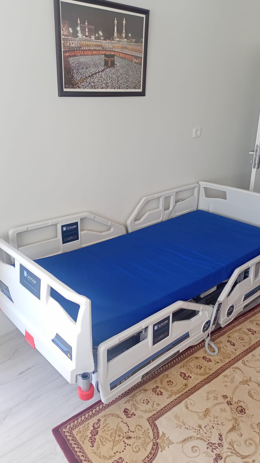- Patient Mattress Brand-Model: The mattress brand could not be identified as there is no visual of its brand or label in the images. However, a mattress compatible with the bed, with a blue protective cover, is present.