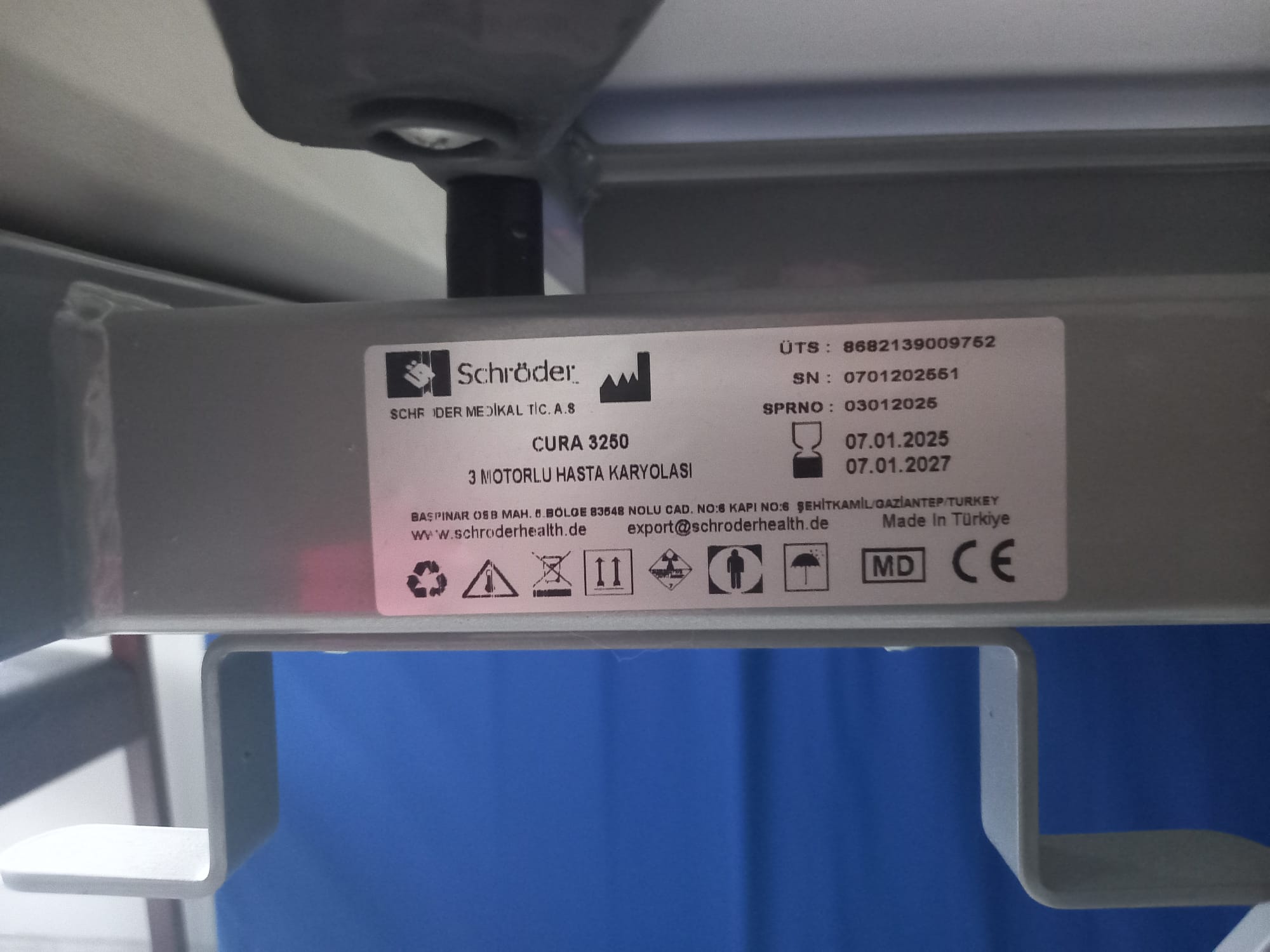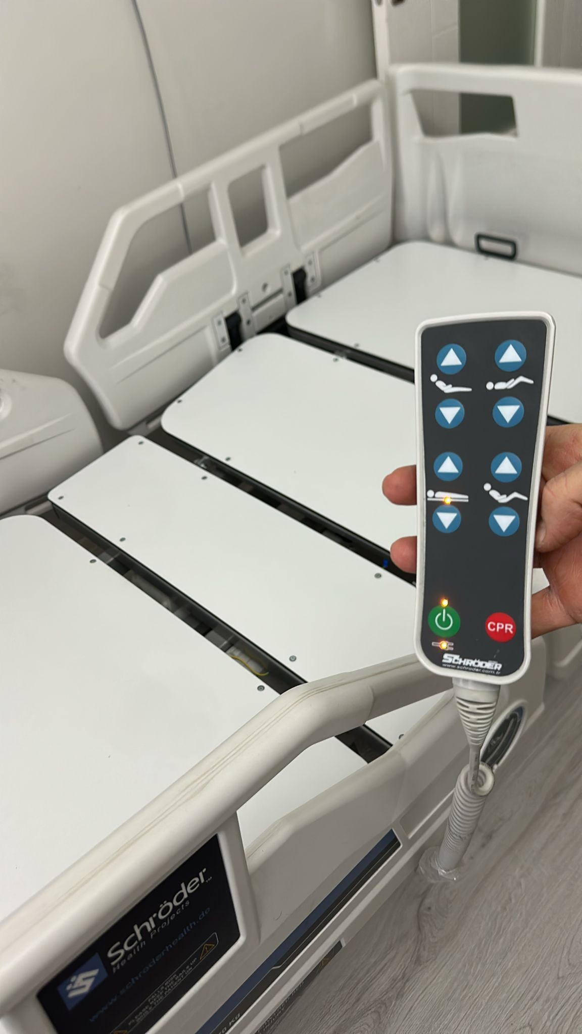 - Patient Bed Brand-Model: Schröder Cura 3250 (Stated as “3-Motor Patient Bed” on the label.)