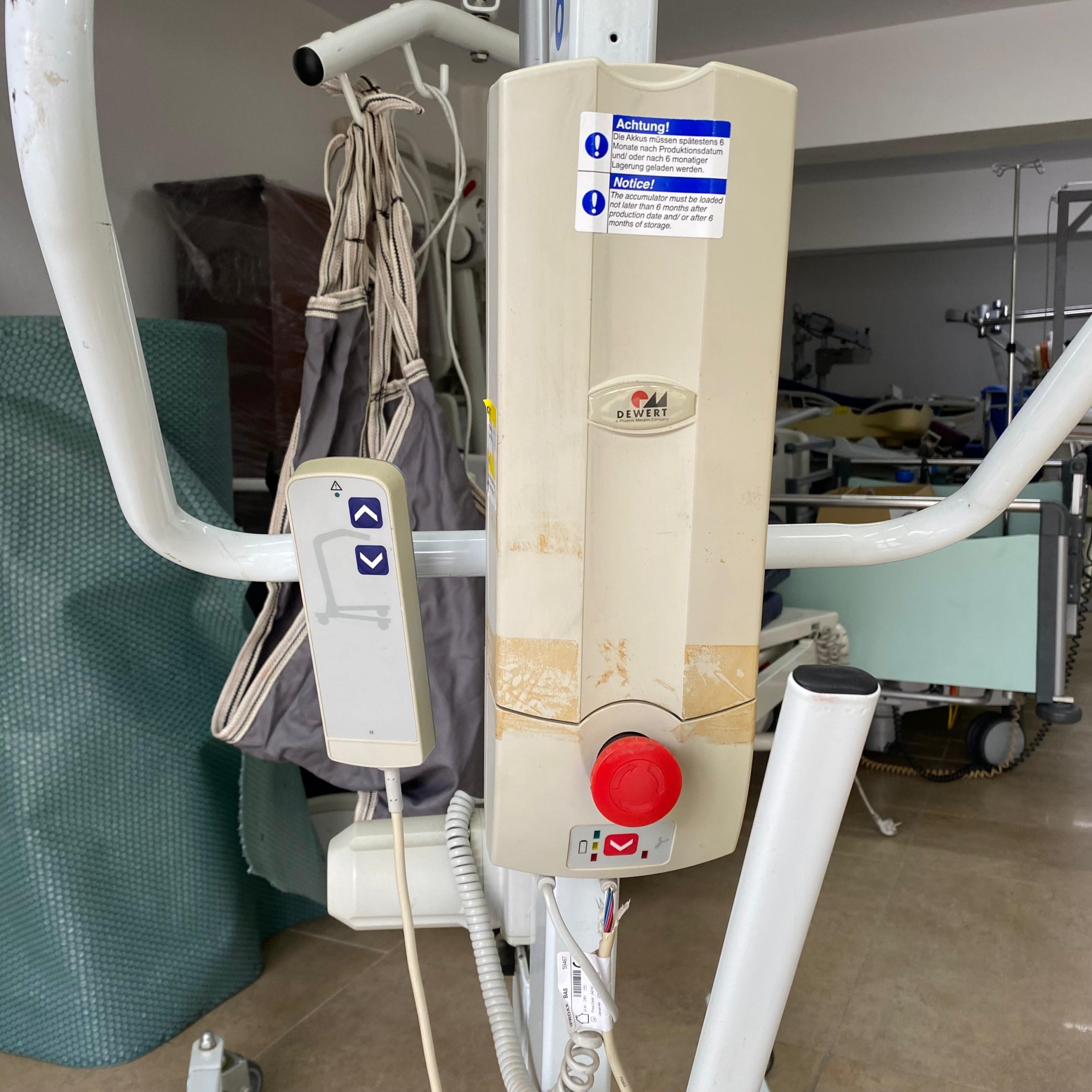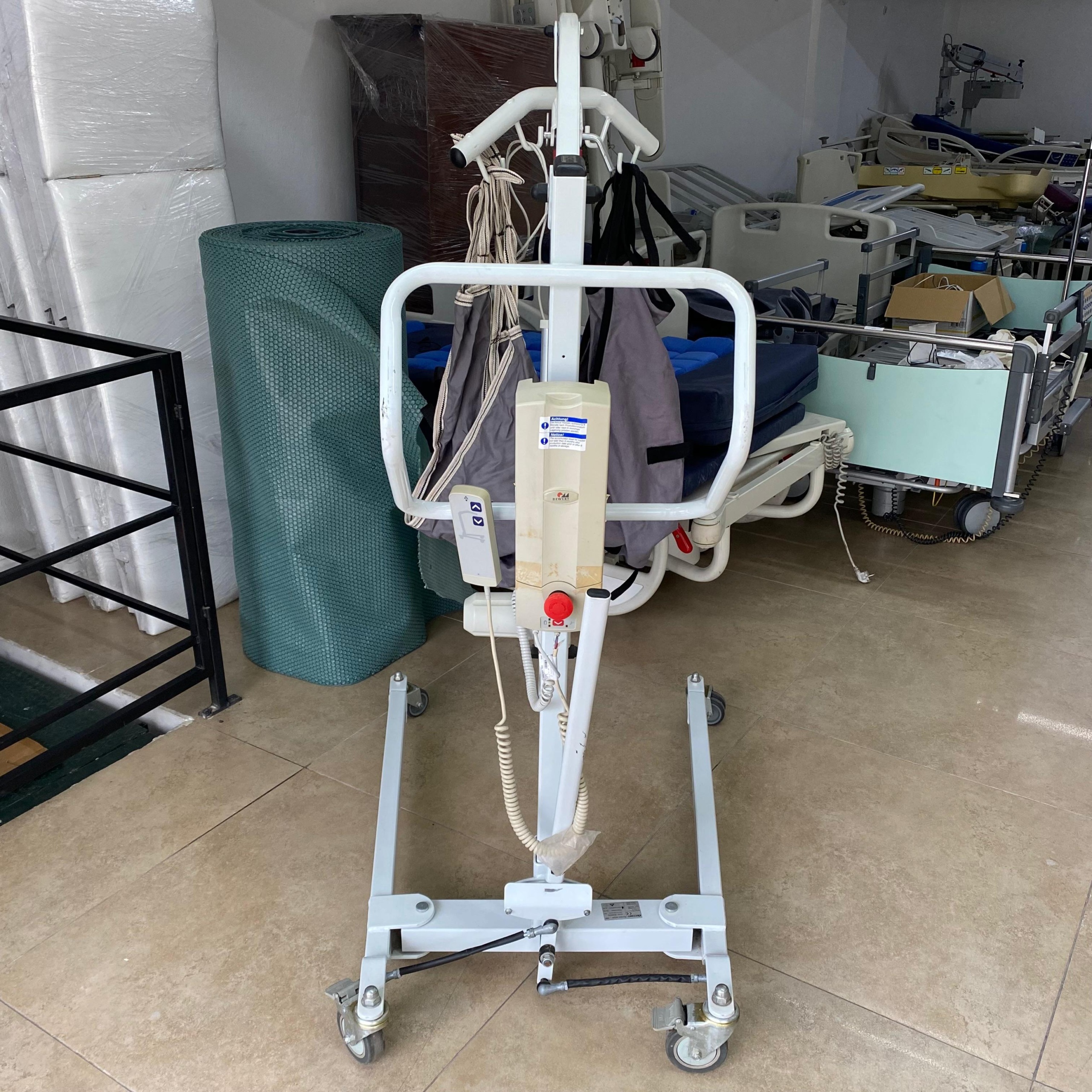 - Transfer Cloth (Sling): One grey, fabric-made transfer cloth is hanging. The connecting straps of the cloth appear sturdy. Excessive tears or unraveling on the fabric cannot be discerned from the visual, but it is a used product.