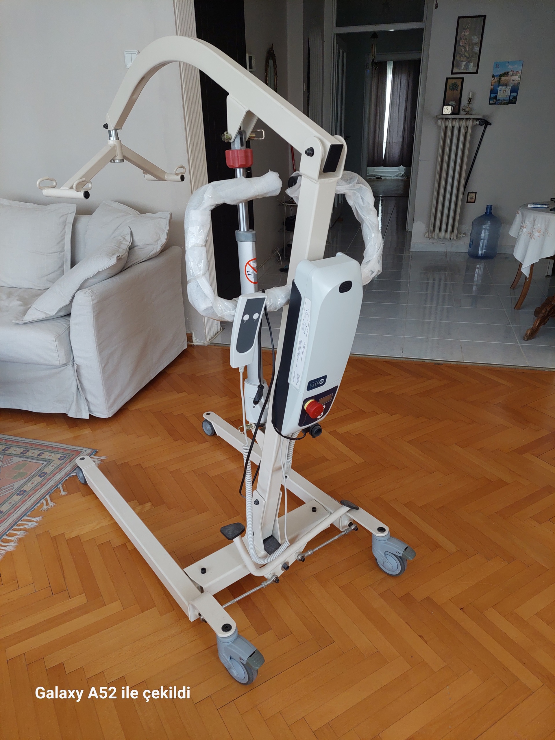 Upon examination of the visuals, the overall design structure of the product is in the form of a standard medical lift. However, labels or logos containing brand and model information are not clear enough to be read with 100% certainty in the images. Therefore, no estimated brand has been specified to avoid misleading information. The condition of the relevant parts is detailed below: