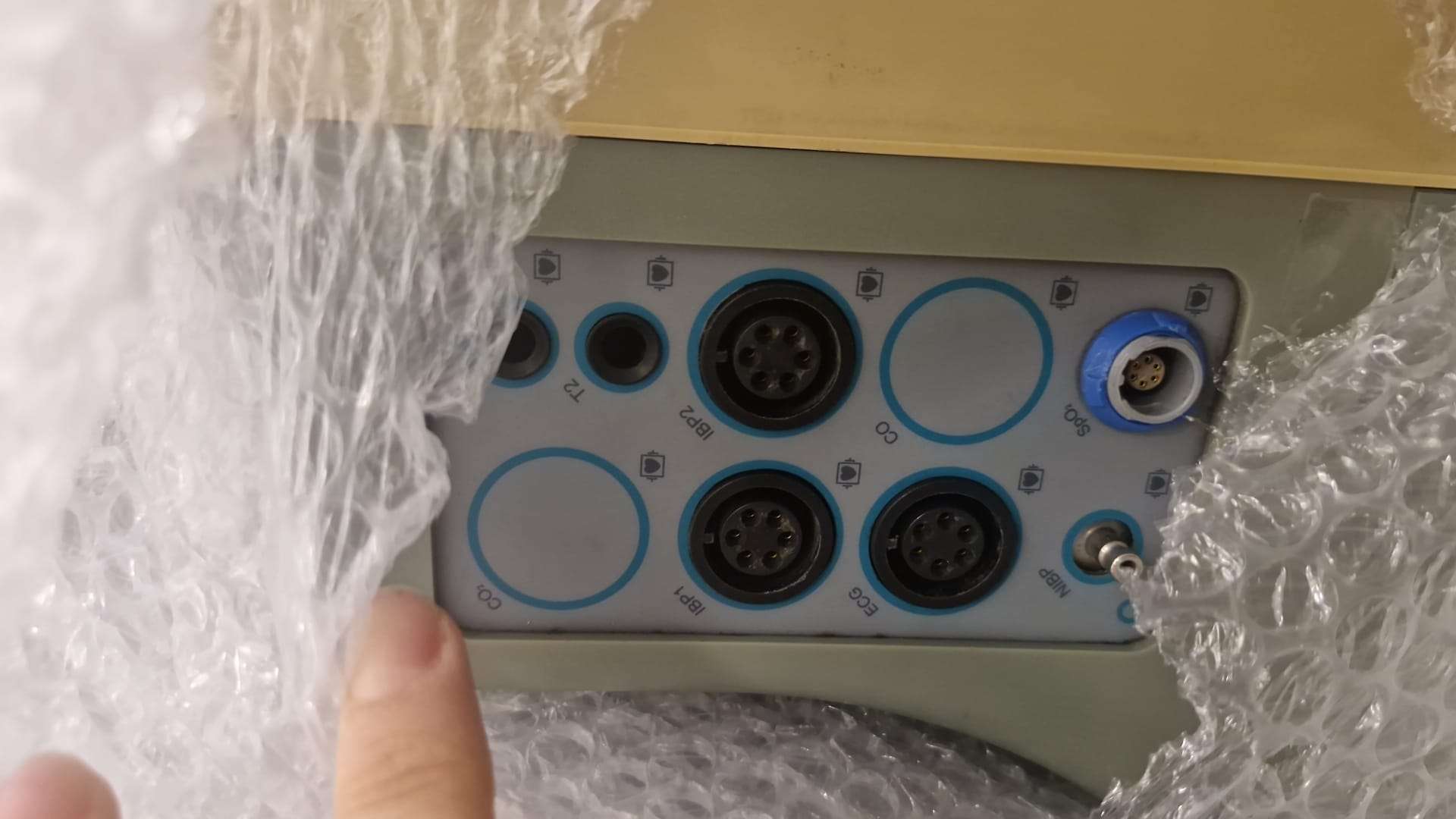 Upon examining the side panel of the device, the condition of the connection ports is as follows: