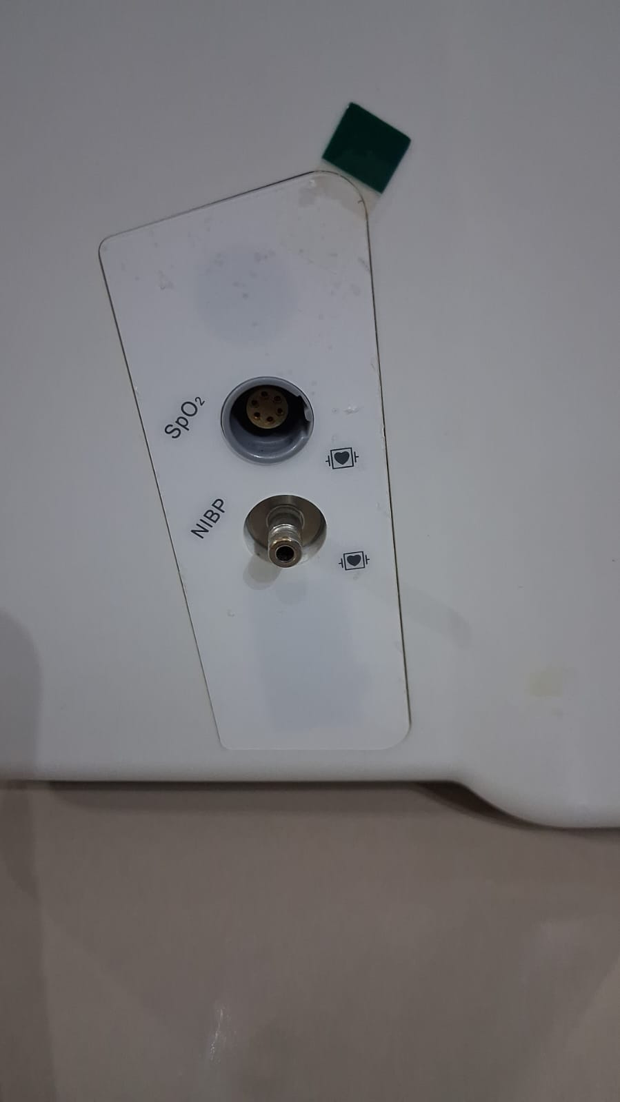 - Ports and Buttons: The SpO2 and NIBP socket inputs located on the side panel are clean and undamaged. The physical control buttons below the screen are in place and appear robust.