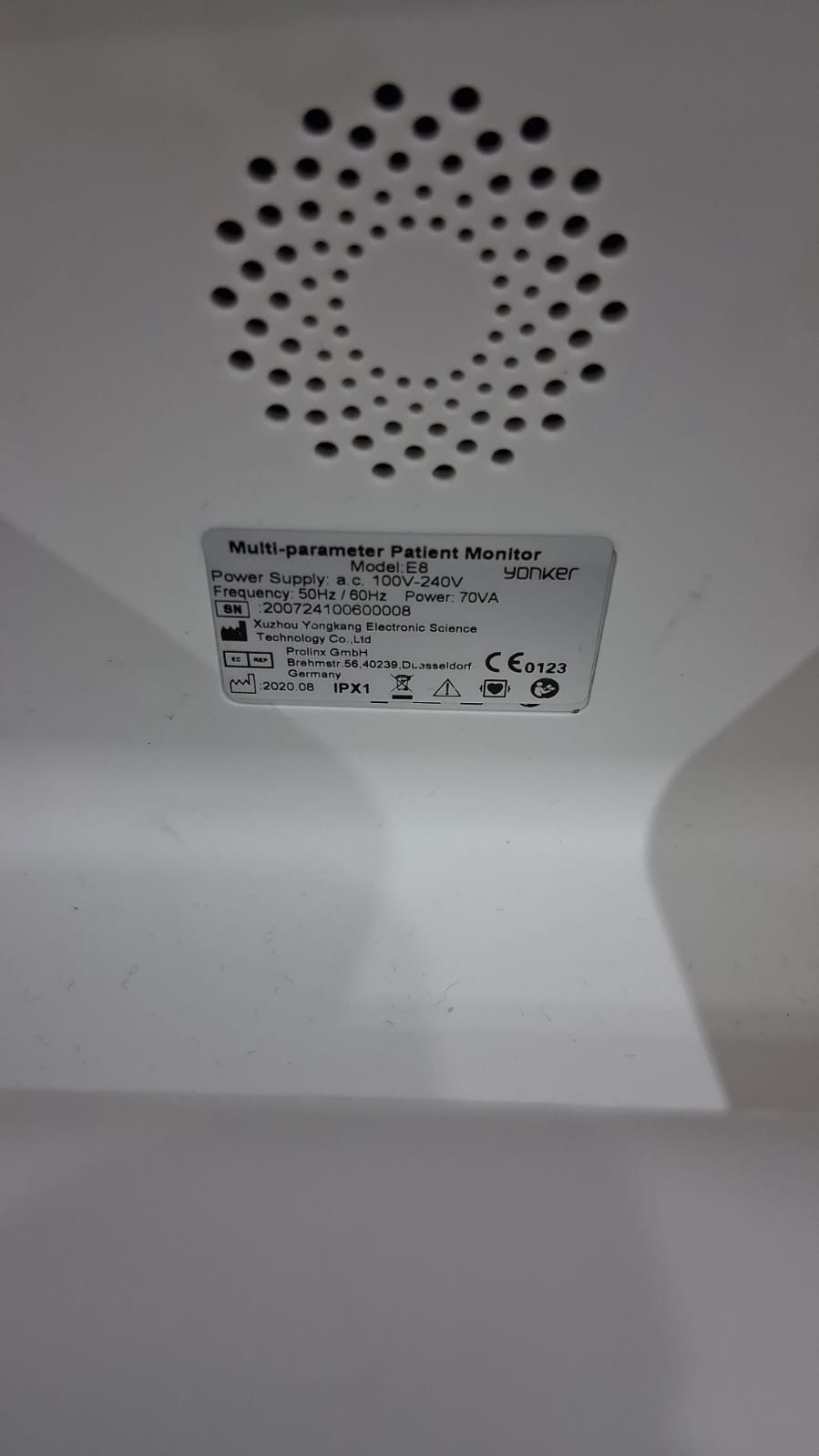 The images show a bedside patient monitor and its accessories, used for tracking patients’ vital signs in medical environments. The product’s brand is clearly stated as Yonker on the label on its back panel, and the model as E8. The device is displayed with the necessary sensor and cuff for measuring blood oxygen saturation (SpO2) and non-invasive blood pressure (NIBP). The labels, logos, and build quality in the image suggest that the product is original.