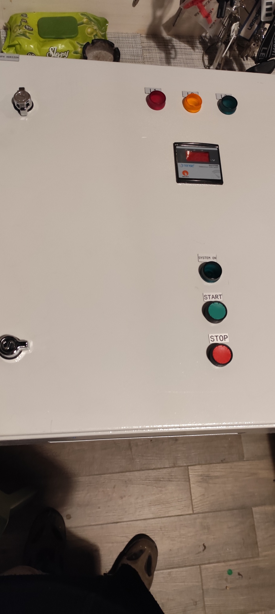- Panel Front Face: The front face of the white metal panel features two keyed locks, three signal lamps (red, orange, green), one digital voltmeter, and three control buttons (“SYSTEM OK”, “START”, “STOP”).
