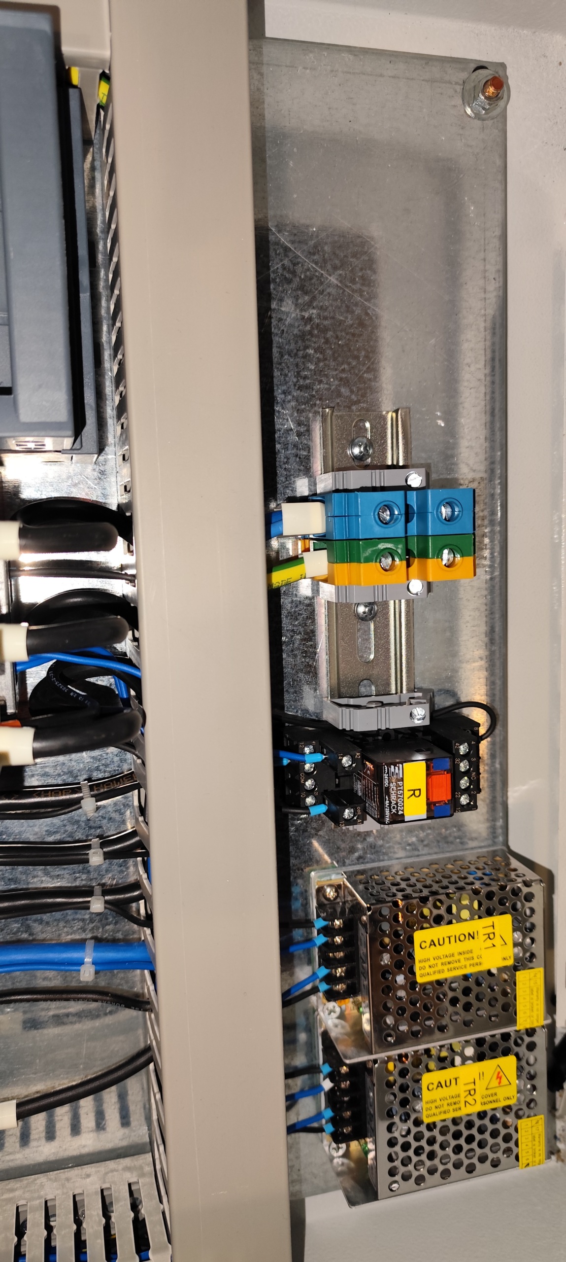 - Panel Interior Structure: Inside the panel, there are Siemens brand contactor and motor protection circuit breaker, automatic circuit breakers, two metal-cased power supplies, and connection terminals. The wiring has been done in an organized manner.
