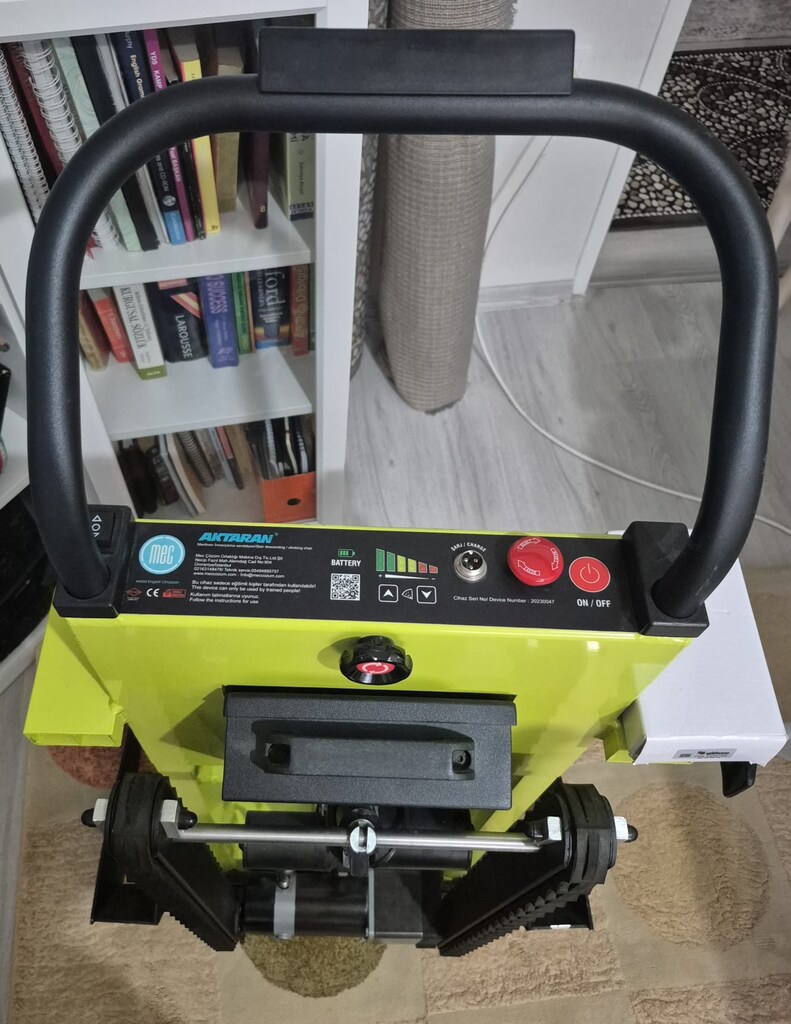 The side tracks (serrated rubber treads), which are the device’s most critical movement mechanism, have been examined in detail. There are no signs of melting, breakage, or excessive wear on the track teeth; the tooth depths appear intact. The two electric motors located at the bottom of the device and the linear actuator (piston) that provides vertical movement are clean. No oil leaks or corrosion marks were found on the outer casings of the motors or the piston rod.