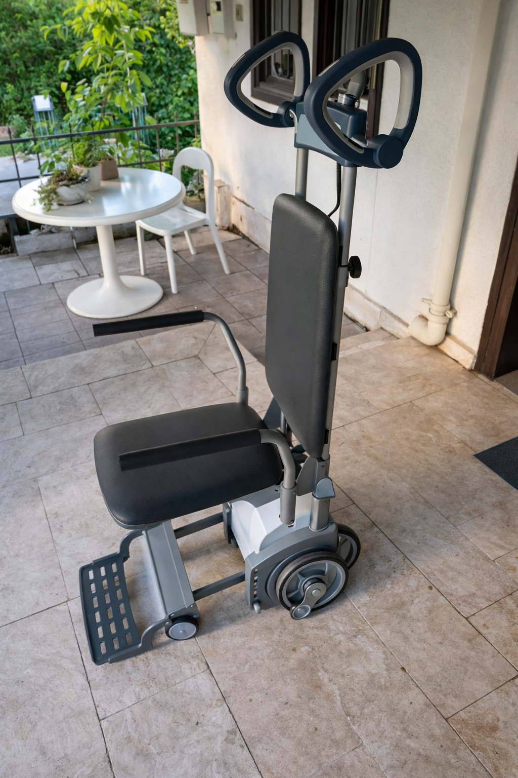 The product shown in the images is a battery-powered stair climber device that enables individuals with limited mobility to ascend and descend stairs with the assistance of an attendant. The device is equipped with an integrated seat and designed for both indoor and outdoor use. The general structure of the product indicates a design aimed at safely transporting the user.