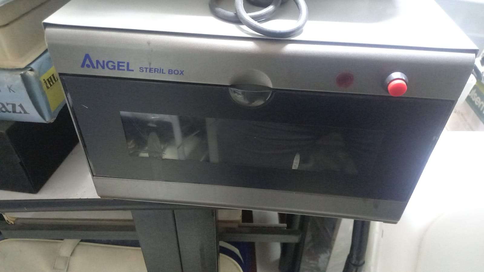 The device shown in the visuals is a sterilization box. On the front panel of the device, the brand Angel and model information STERİL BOX are clearly visible in blue letters. This device is typically used for sterilizing small tools and materials. The visual shows a total of one sterilization device and one power cable, which appears to belong to the device.