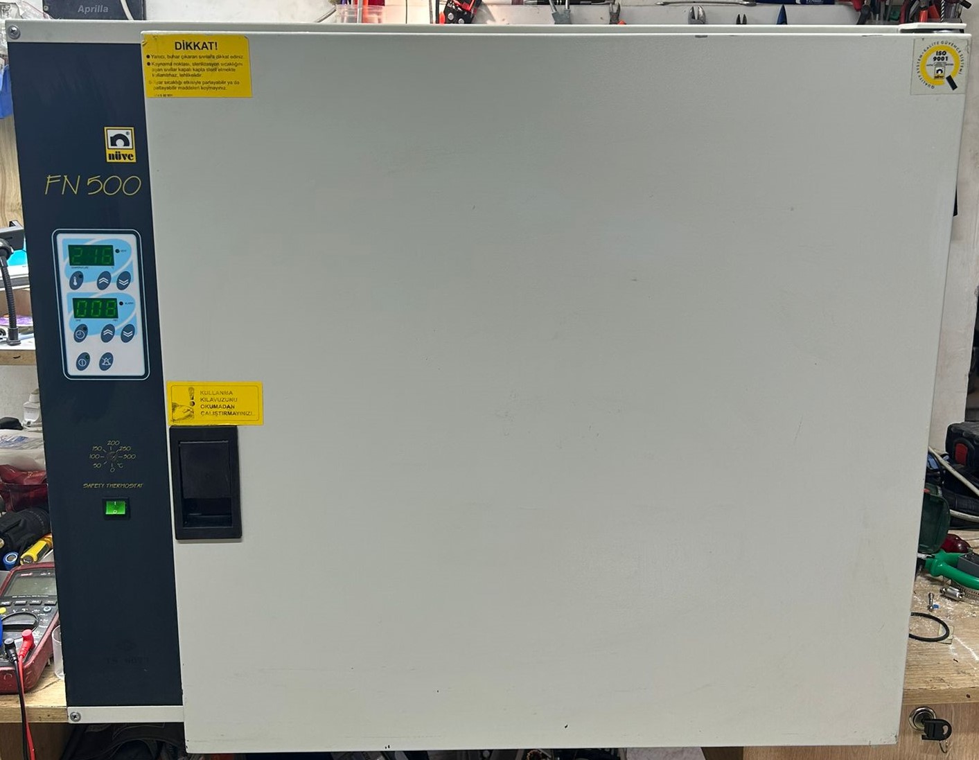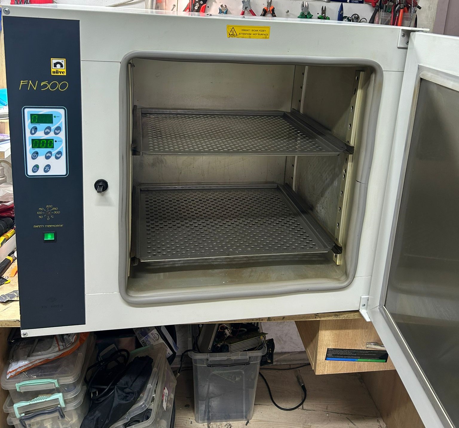 The device shown in the images is a dry air sterilizer (oven) used in laboratory and medical fields. Based on the logos and inscriptions on the front panel of the device, its brand has been definitively identified as Nüve and its model as FN 500.
