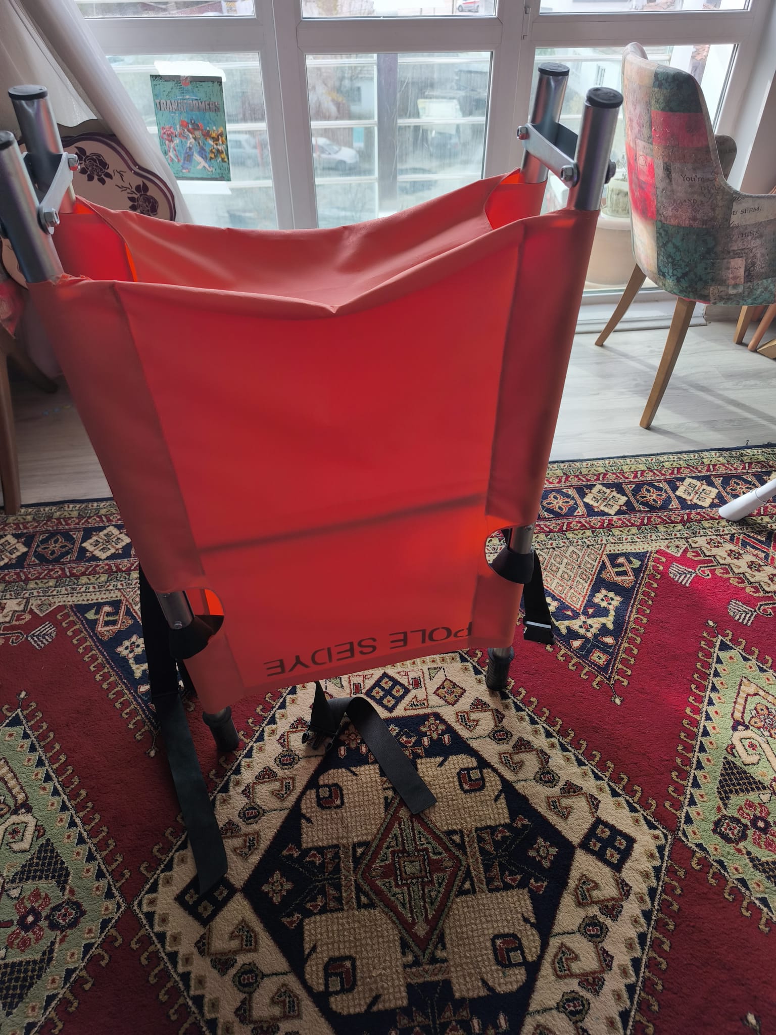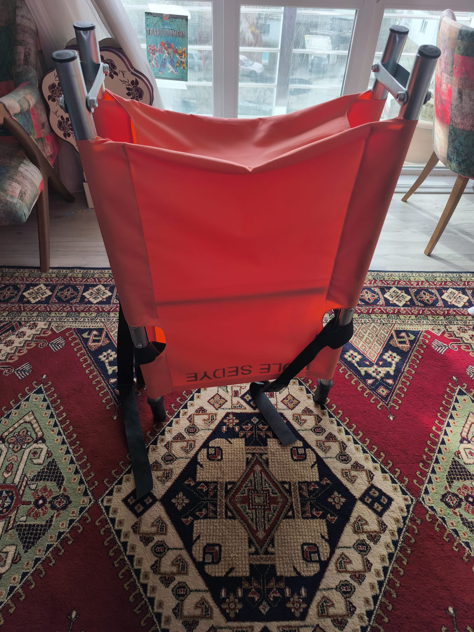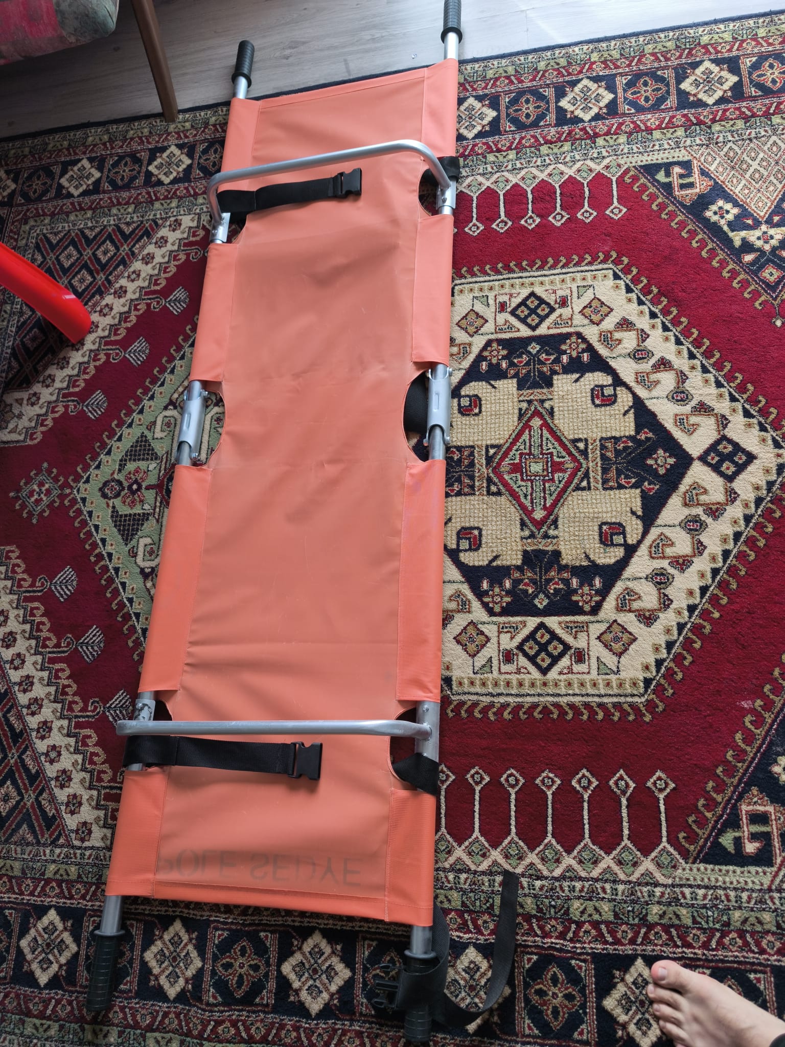 The product appears to be very clean and almost new in terms of overall condition. No signs of use were found. The stretcher’s orange fabric remains vibrant, and the metal frame retains its shine. It is assessed to be well-maintained and ready for use.
