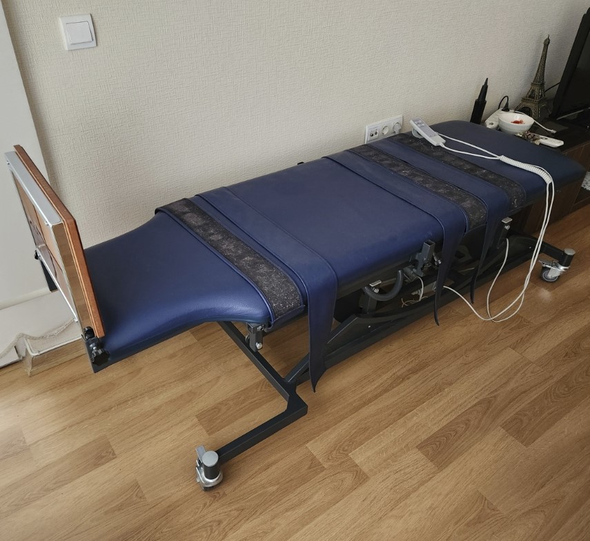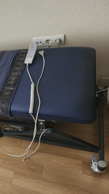 The motorized mechanism that adjusts the table’s height and tilt appears to be an integrated structure, as understood from the images. It is controlled by a white, wired hand remote. The remote has buttons indicating adjustment functions. Cables and connection points are generally in good condition, with no crushing or breakage observed.