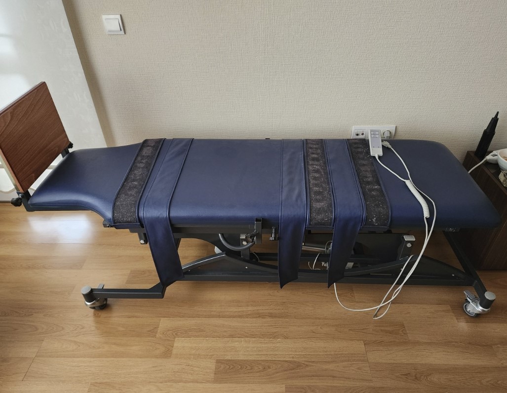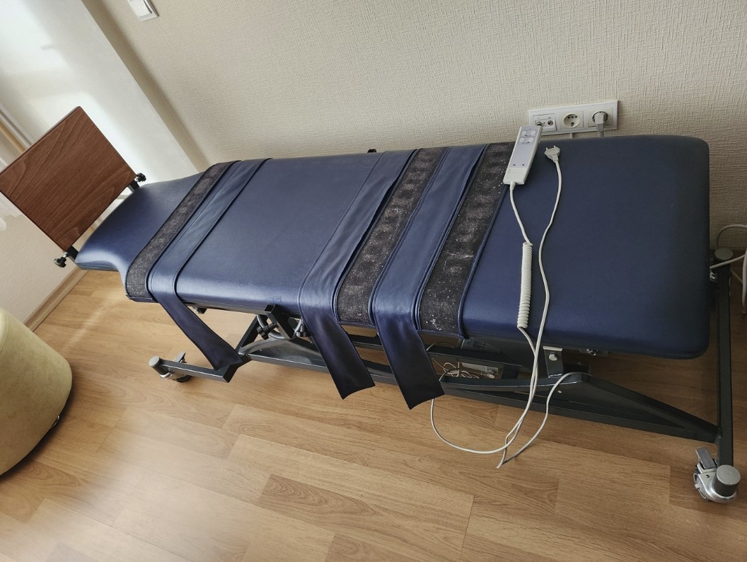 No scratches, tears, discoloration, or stains are visible on the table’s blue upholstery, other than areas that might be concealed by the fastening straps. The metal frame and mechanical components have a sturdy and clean appearance. No breaks or deformations are found on its wheels.