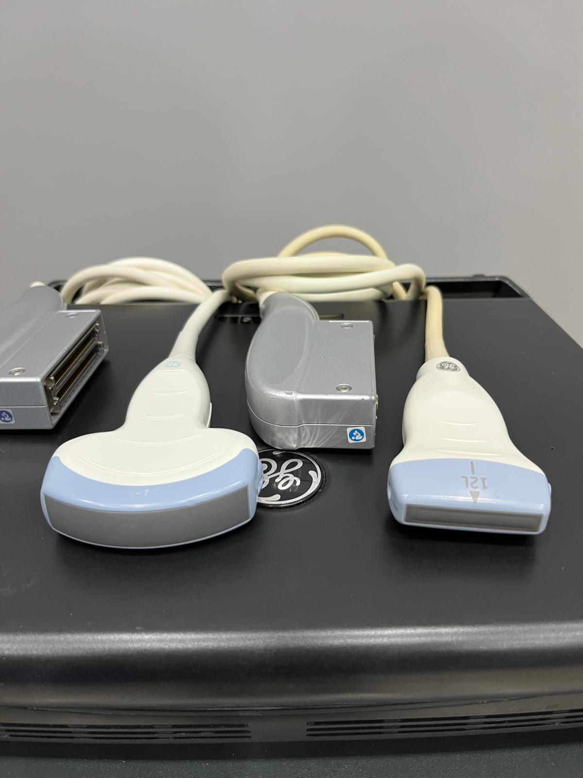 - Probe 1 (Brand/Model): The inscription “12L” is clearly legible on the probe head in the image. This is a GE 12L-RS model Linear probe. It is generally used for vascular, small organ, pediatric, and musculoskeletal imaging. It features a blue-striped, flat-tipped design.