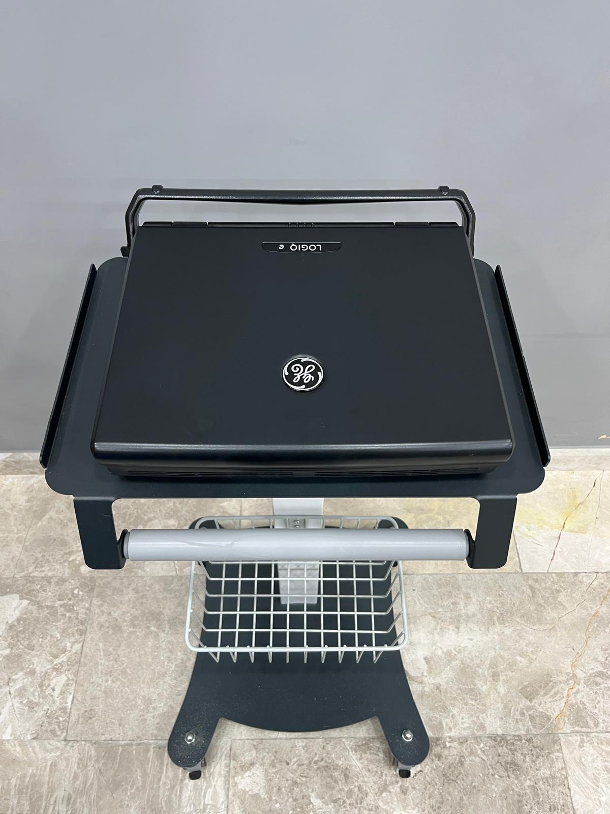 - Transport Stand: The device is on a special stand that perfectly fits underneath it, features a metal basket at the bottom, and has a grey handle at the front. Its wheeled structure ensures the device’s mobility.