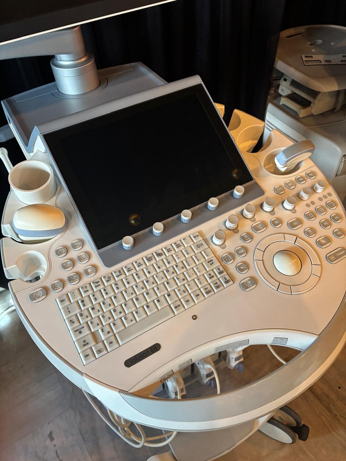 The model name Voluson E8 is clearly legible on the device’s control panel, just below the keyboard. The circular logo located on the side and front panel of the device’s body, along with the button layout on the control panel, confirms that this device belongs to the GE (General Electric) brand.