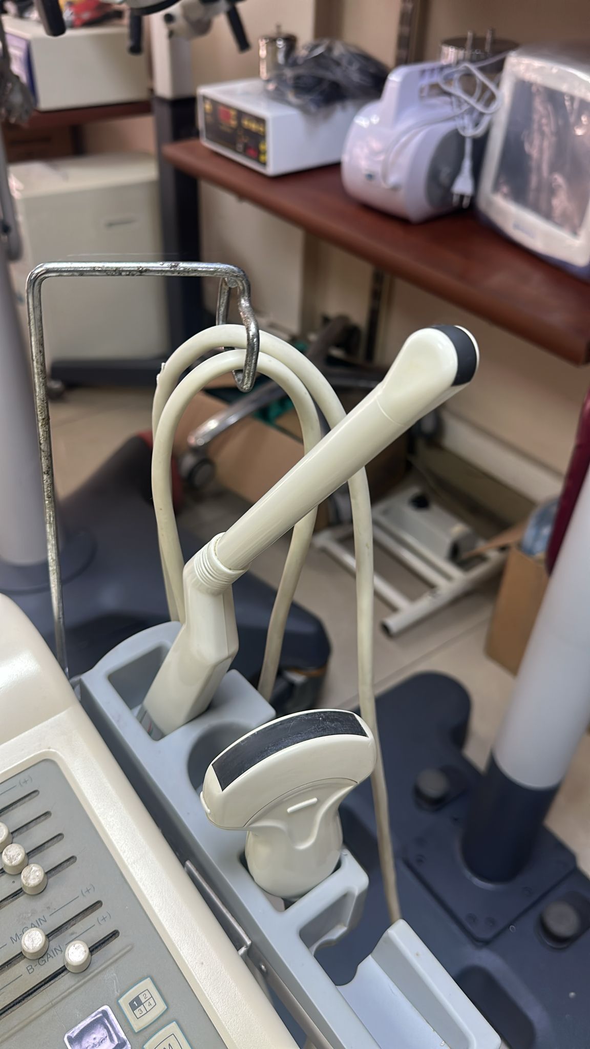 - Control Panel (Keyboard): The QWERTY keyboard and ultrasound control buttons (TGC settings, Gain knobs, etc.) are physically in place. No missing keys were detected in the visuals. However, the need for cleaning and maintenance is evident.