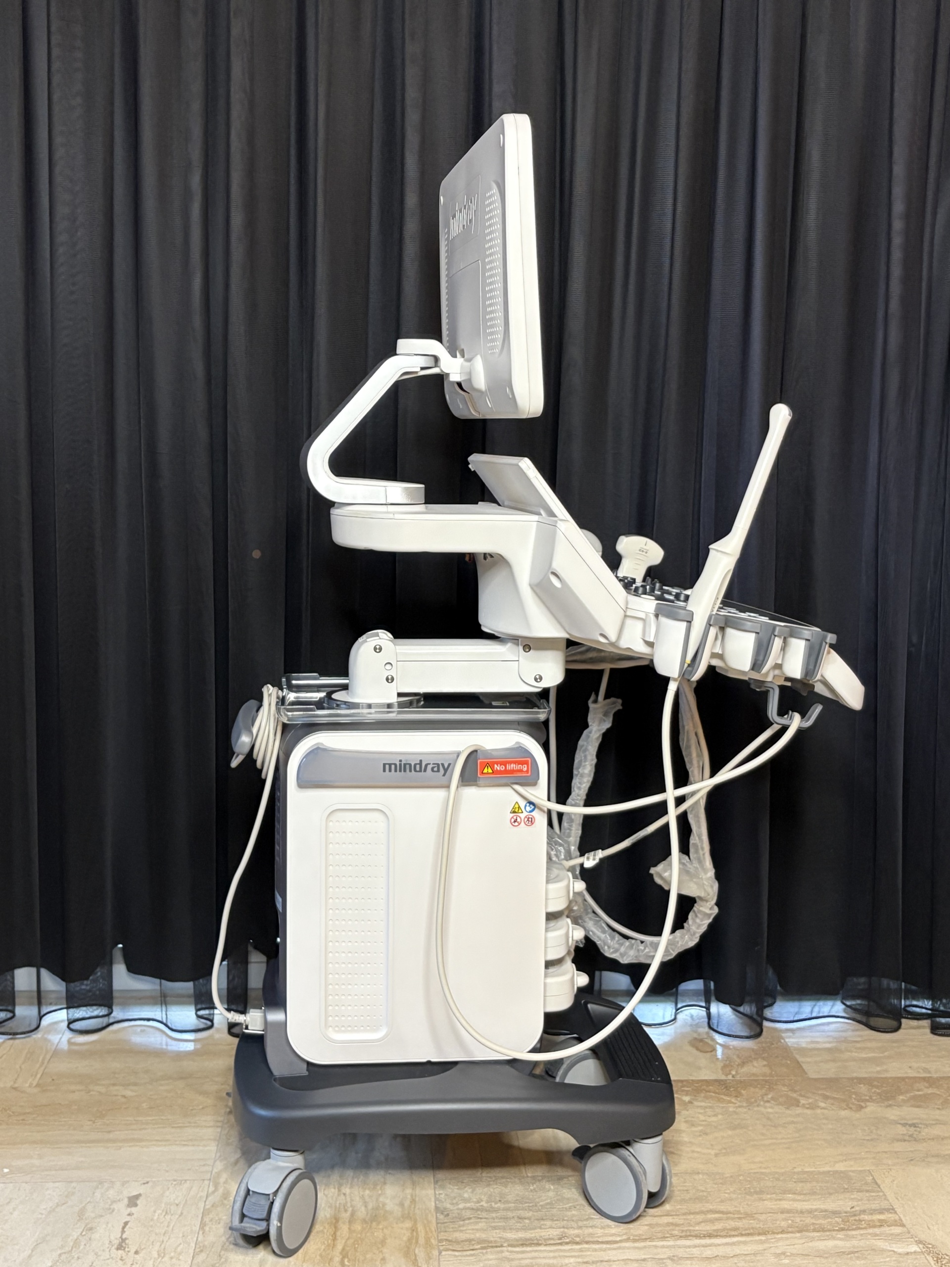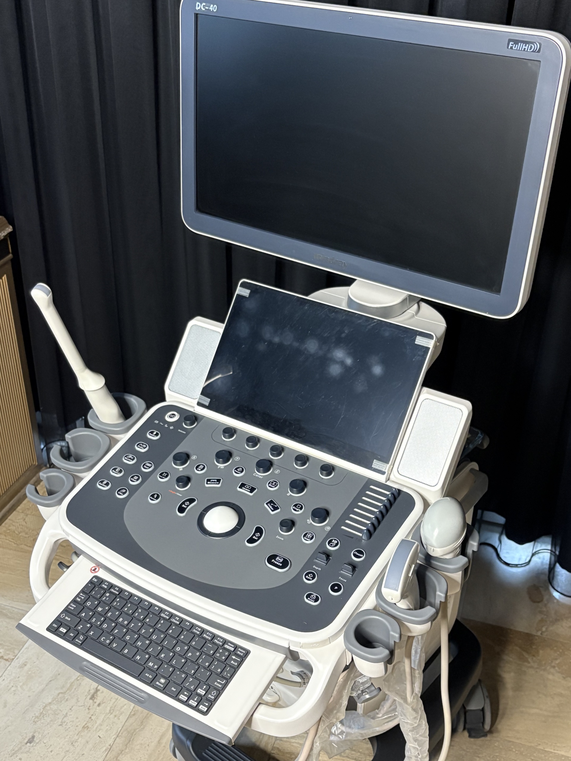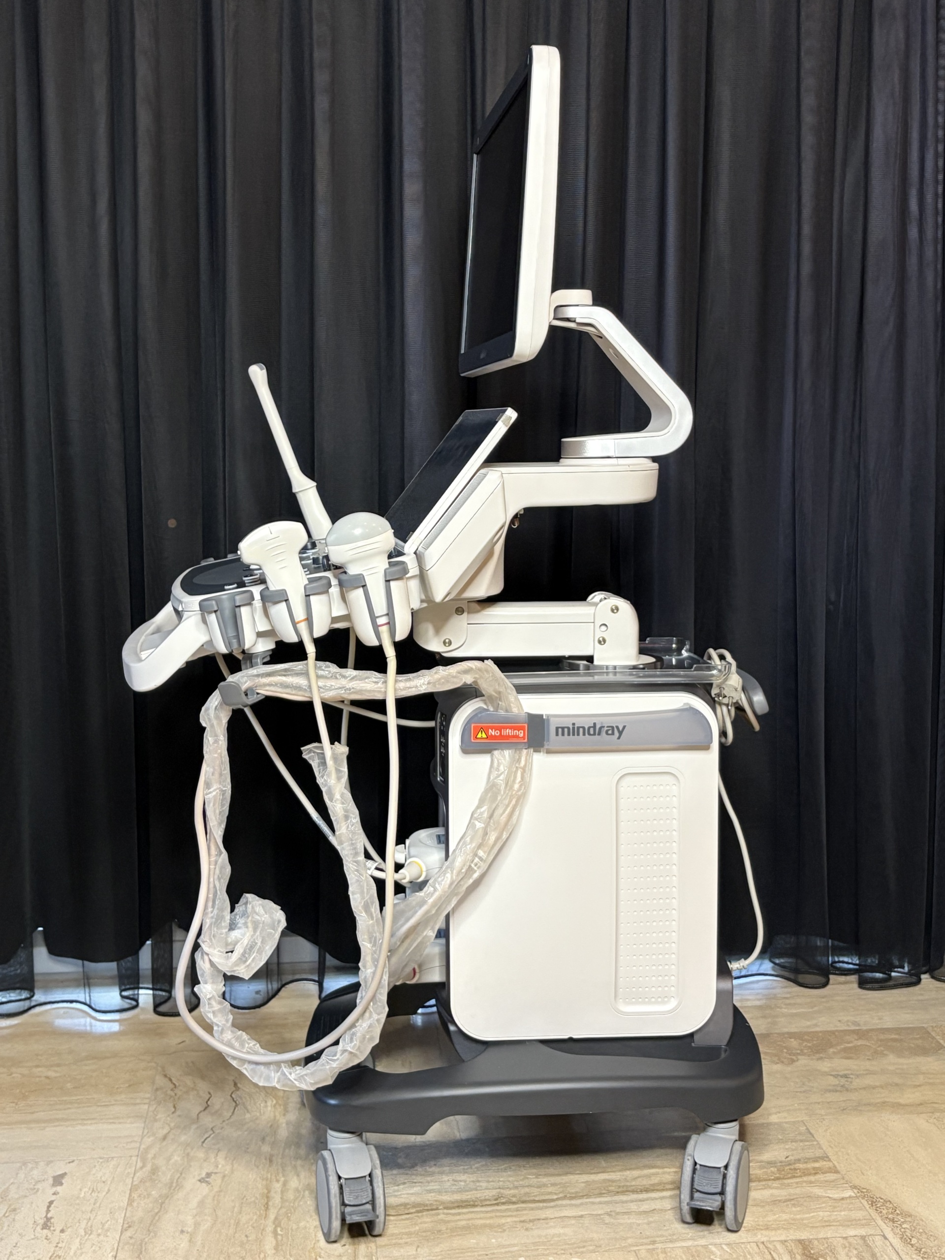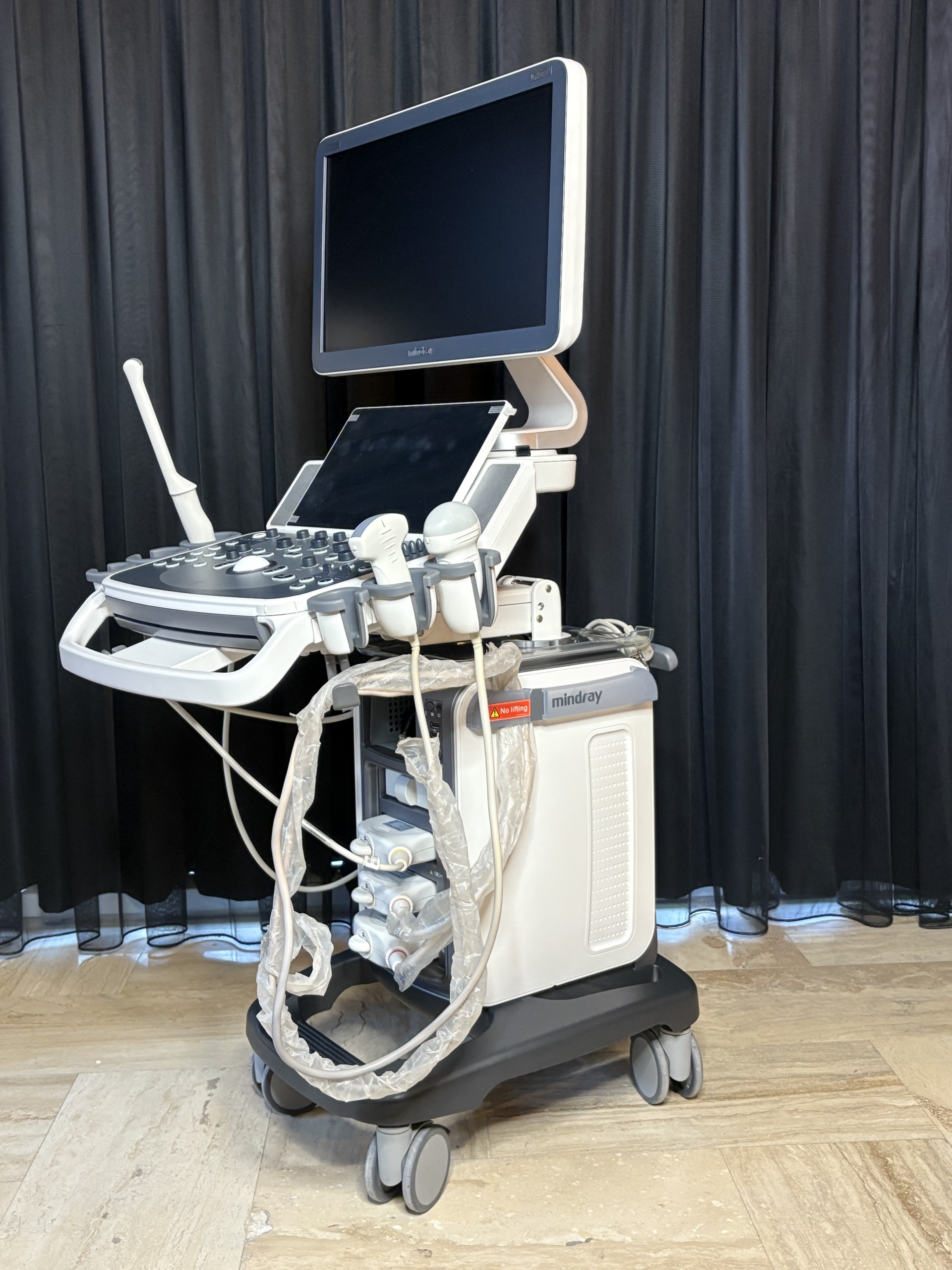 - Ultrasound Probes: 3 out of the 4 probe inputs on the front of the device are occupied. The cables of the 3 connected probes are wrapped with transparent protective sleeves (stretch-like material). This indicates that the cables are intended to be protected against dirt or wear. Since the probe heads are in their slots, the probe types (convex, linear, etc.) cannot be clearly distinguished.