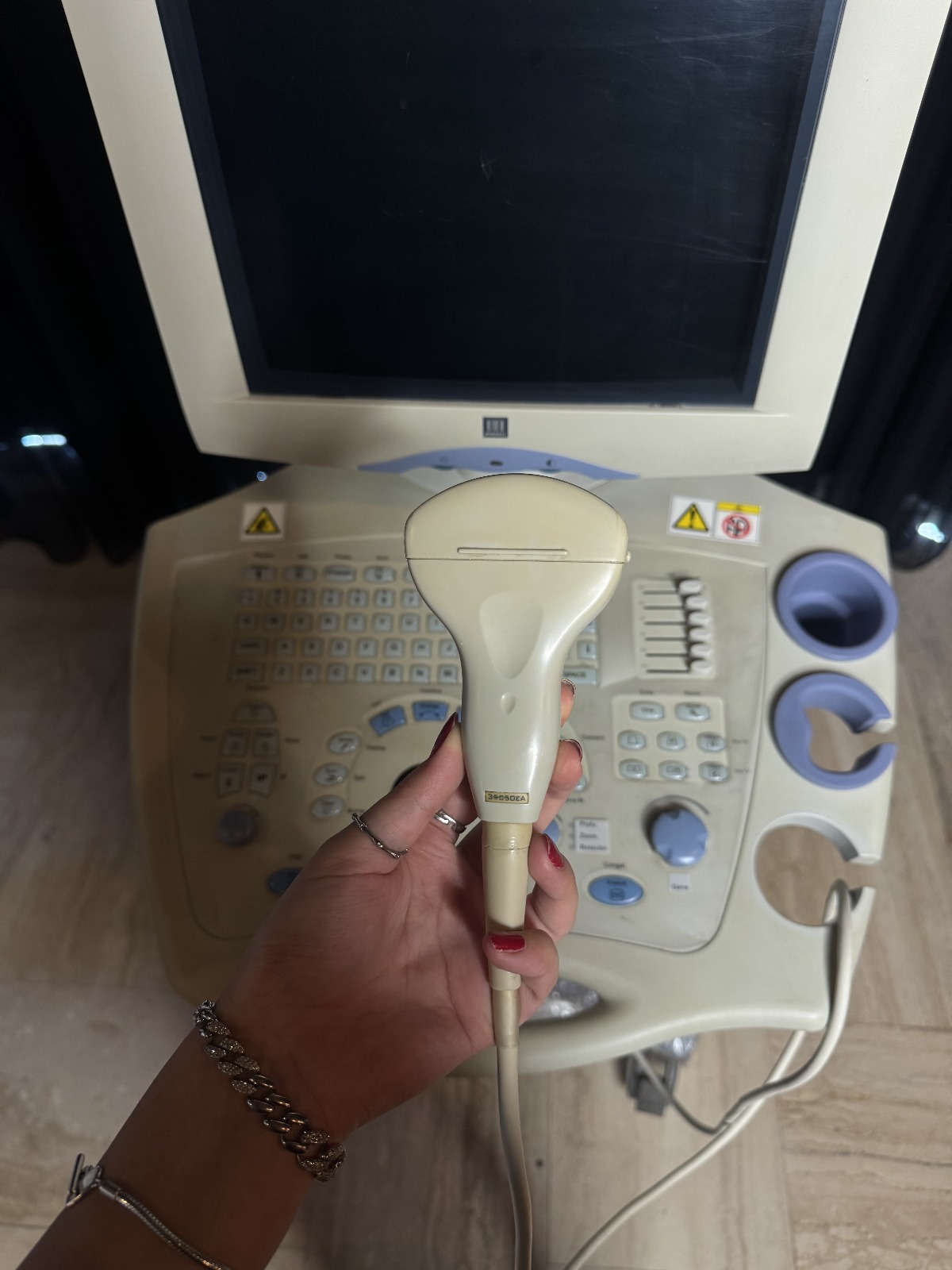 The images show 1 main ultrasound device unit (including stand and monitor) and 1 ultrasound probe connected to the device.