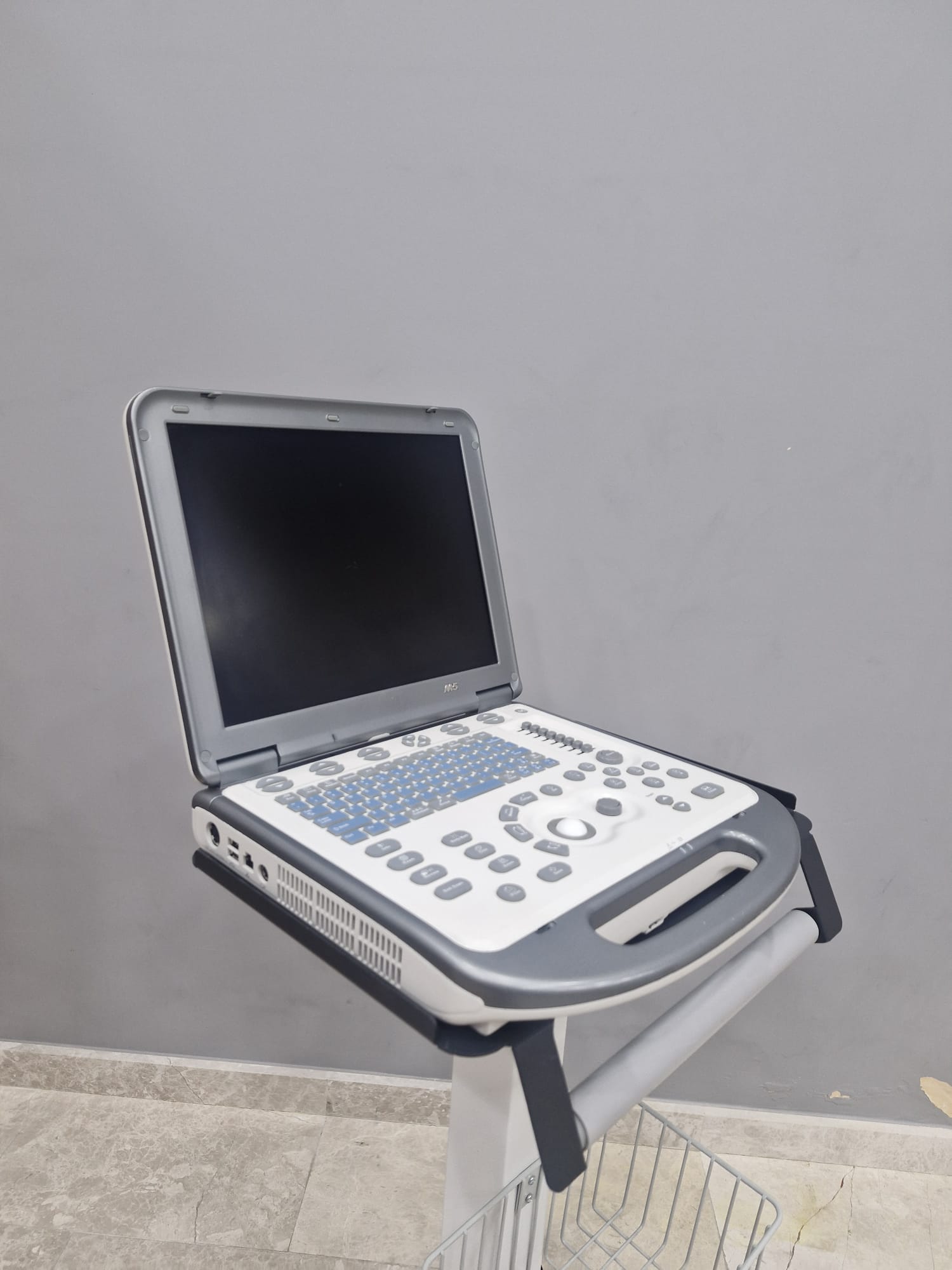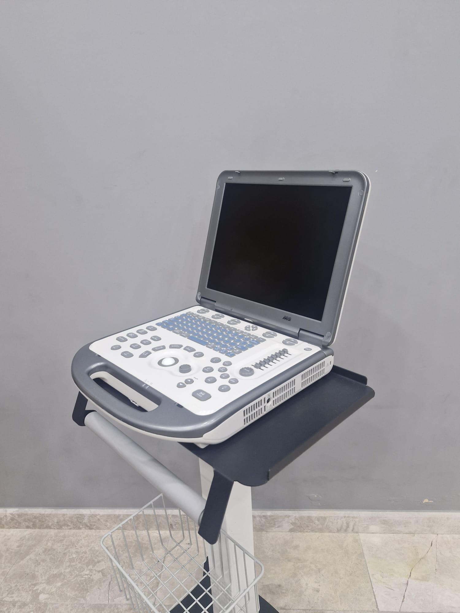 - Trolley: The device is on an original stand designed for ergonomic use. The stand features a basket section at the bottom for accessories, an upper platform that secures the device, and handgrips.